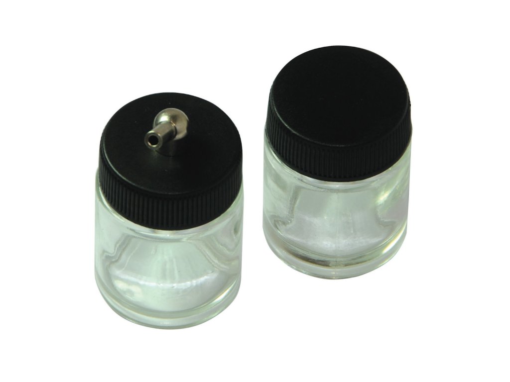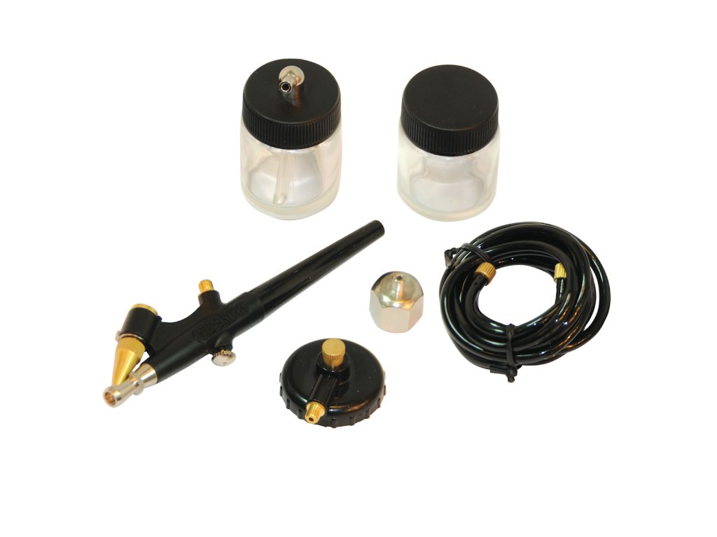 Sprühset für Modellbau, Kunst und Handwerk. Das variable Sprühbild und die Reichweite werden mit einer Venturi-Düse eingestellt. Es kann mit einer Treibgasflasche oder mit einem geeigneten Airbrush-Kompressor betrieben werden, wenn eine längere Nutzung erforderlich ist. Zwei 22-ml-Behälter, 1,6 m Luftschlauch, 1/4"-Luftadapter zum Anschluss, Betriebsdruck 1 – 2 bar (15 – 30 psi), Düsendurchmesser 0,8 mm.