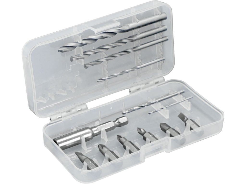 - Zubehör: Bohrer 1,5 - 2 - 2,5 - 3 - 3,5 - 4 - 5 - 6 mm, Bits (-) 5 mm, PH 1 - 2, HEX 5, TORX 20, Satz von 13 Stück