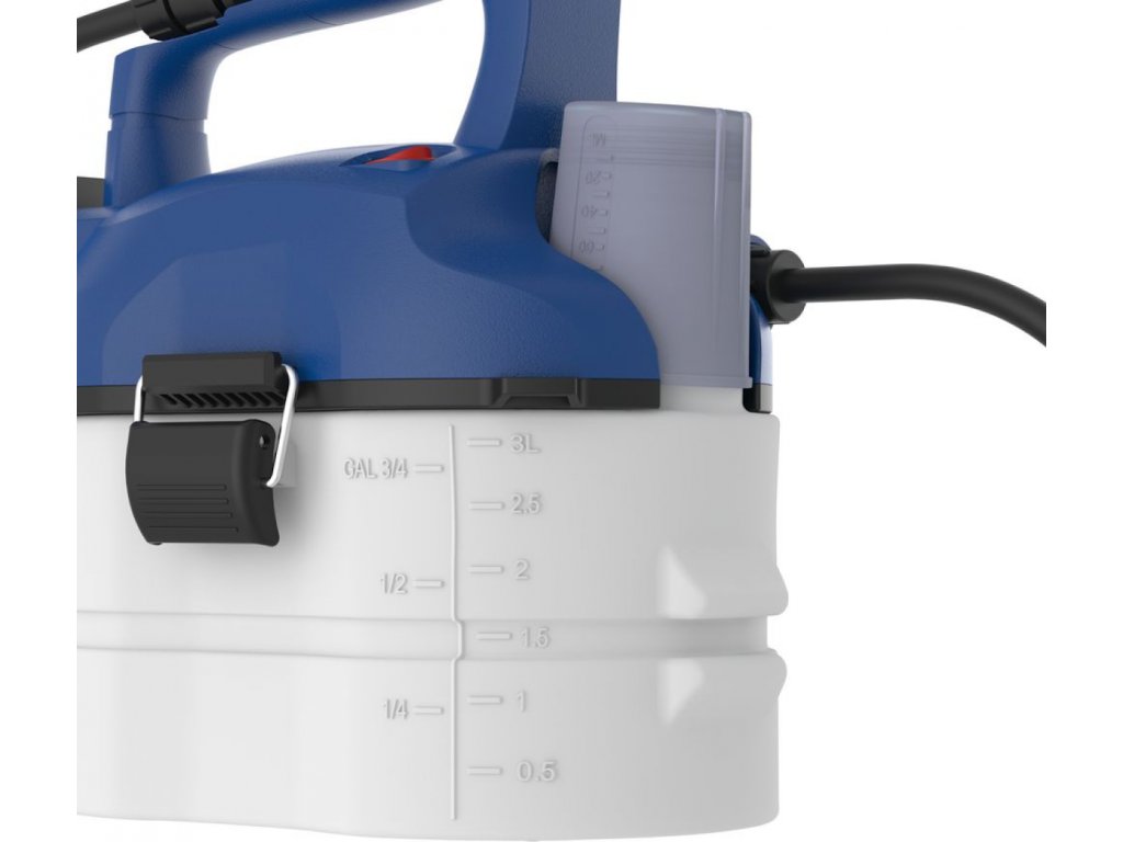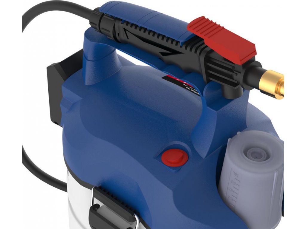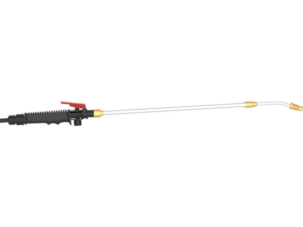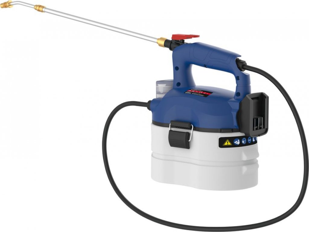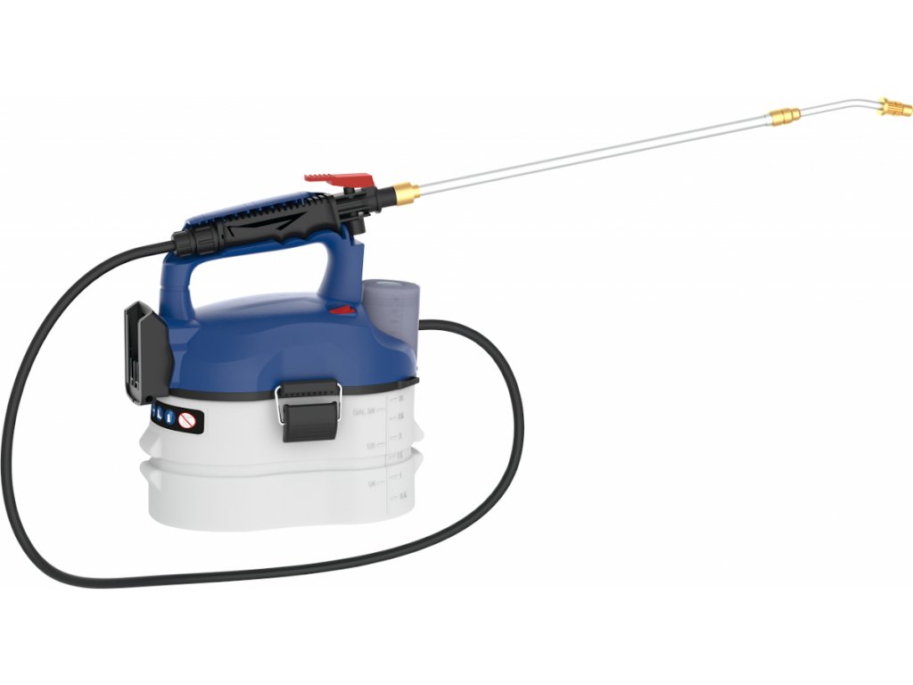 Aufbau: strapazierfähiges Kunststoffgehäuse, ergonomisch geformter Bediengriff, 1,1 m Druckschlauch, 3 l Vorratsbehälter, Messbecher, Tragegriff, Schultergurt.