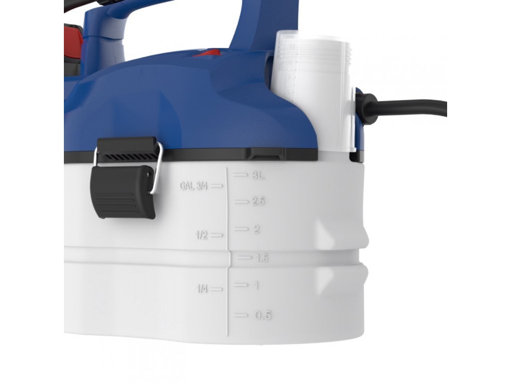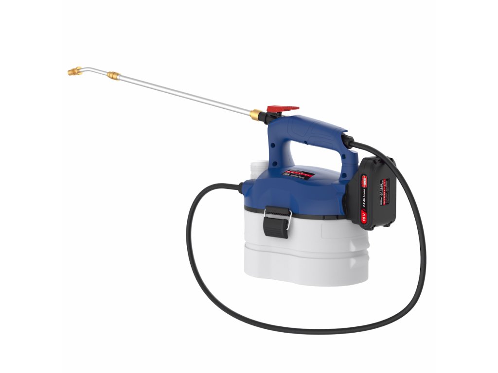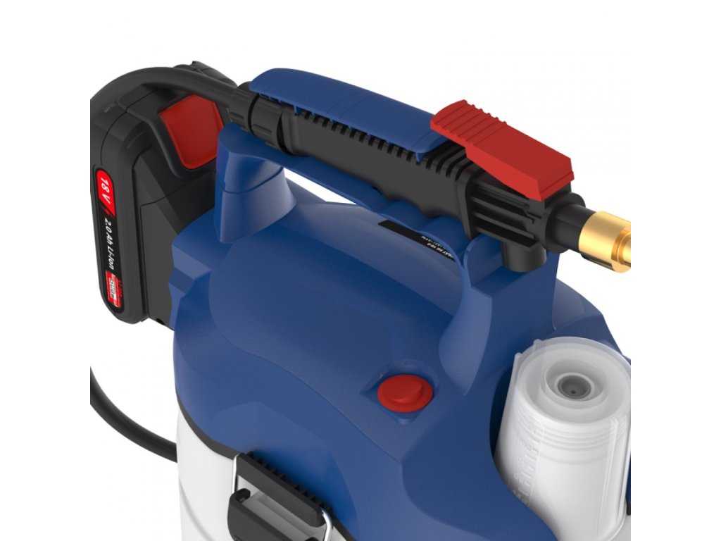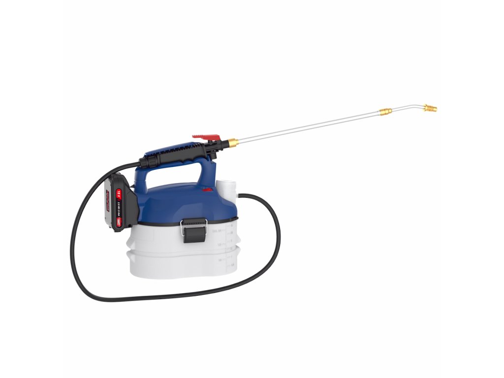 Aufbau: Gehäuse aus strapazierfähigem Kunststoff, ergonomisch geformter Bediengriff, 1,1 m Druckschlauch, 3 l Vorratsbehälter, Messbecher, Tragegriff.