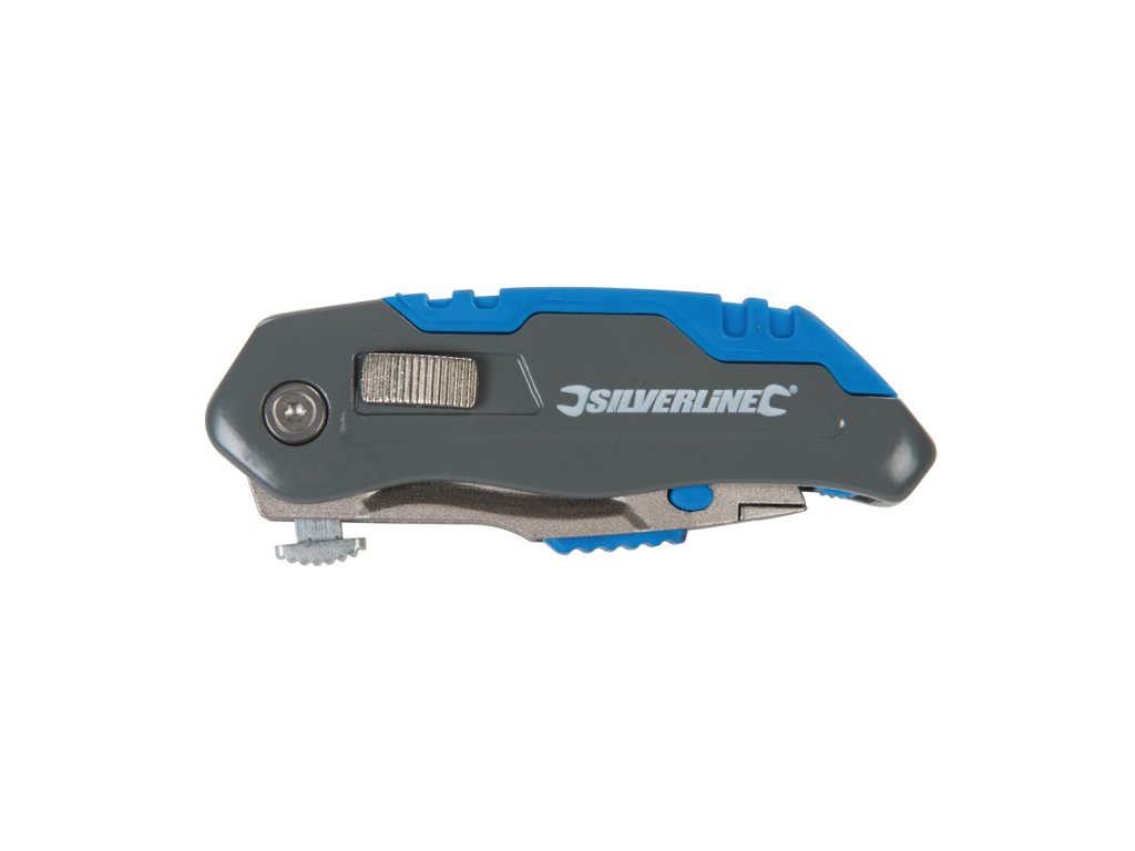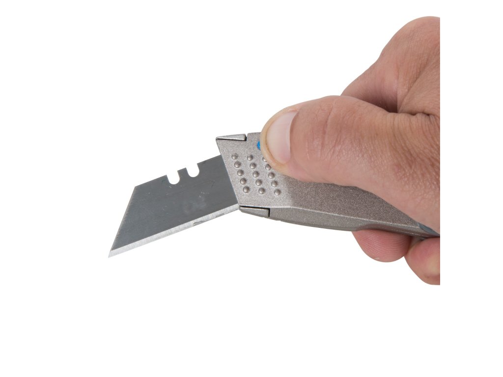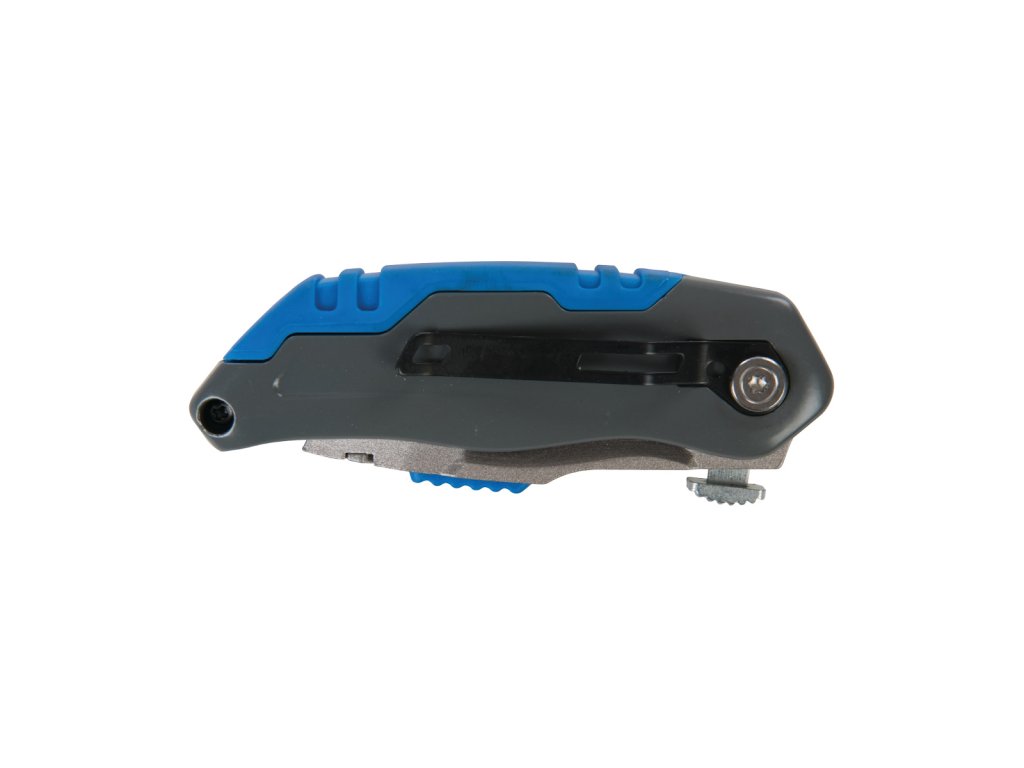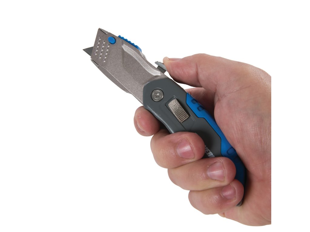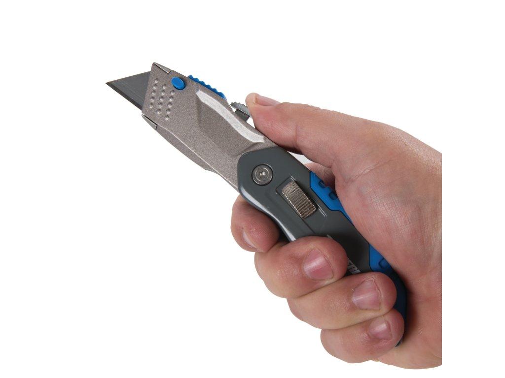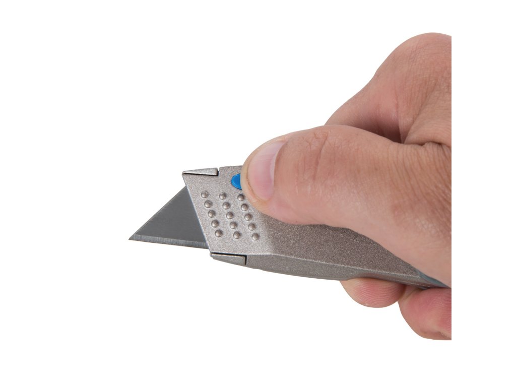 Ergonomischer Griff und robuste Konstruktion. Der Verriegelungsmechanismus sichert die Schnellspannlippe in der geöffneten Position. Schneidet eine Vielzahl von Materialien, einschließlich internem Stauraum für 3 Ersatzklingen.