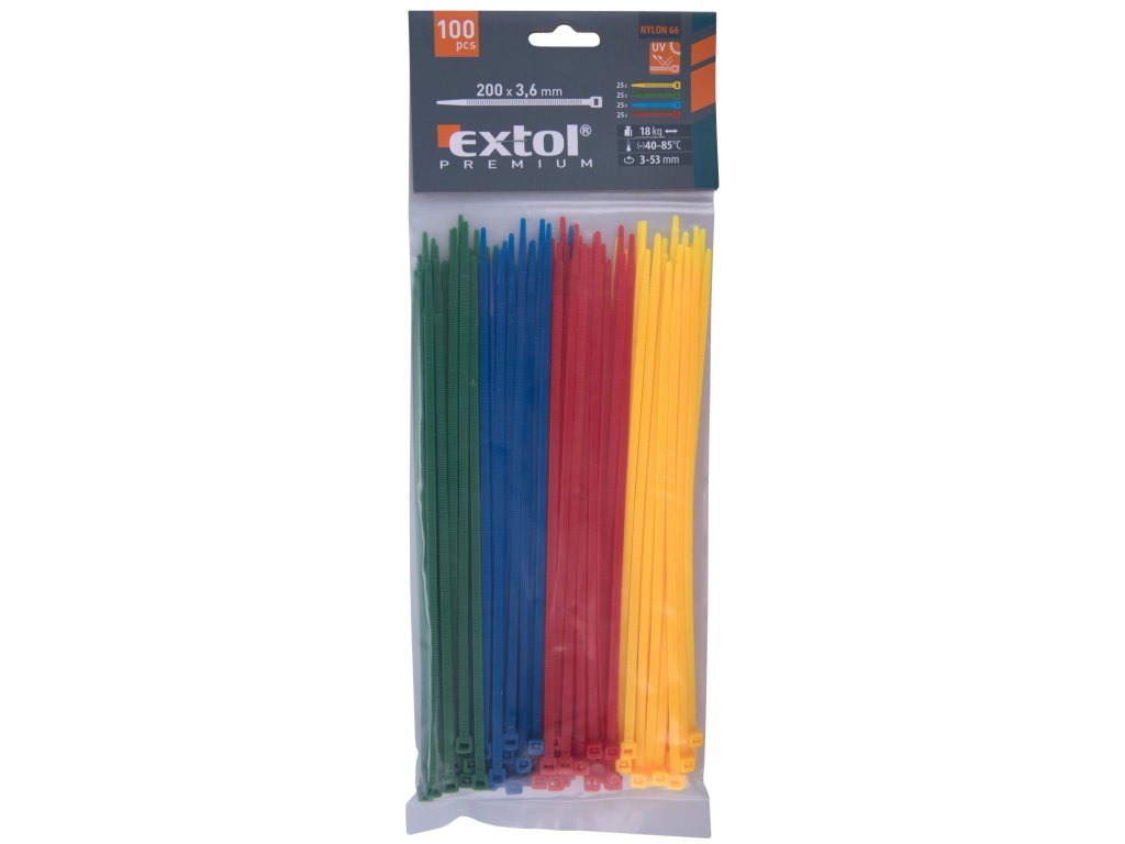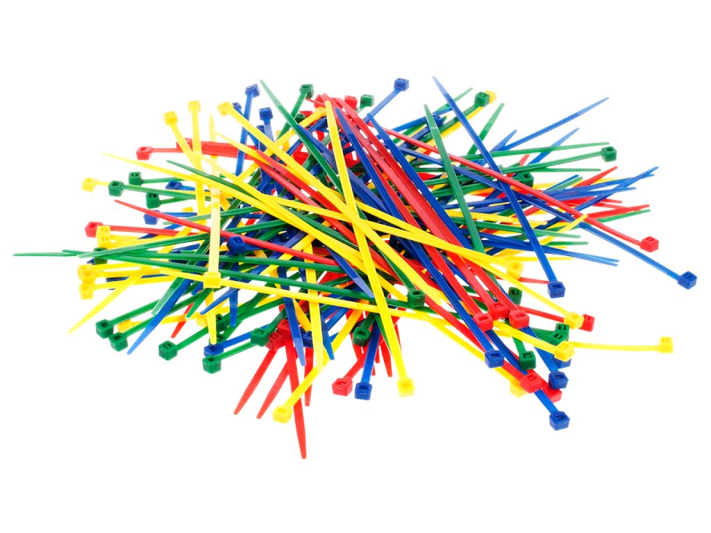 Schnelle, zuverlässige und sichere Bindung oder Befestigung von Kabeln, Leitern und Kabelbündeln. Ausführung aus gelbem, grünem, rotem und blauem Nylon, Maße 200 × 3,6 mm, Menge 4 × 25 Stk.