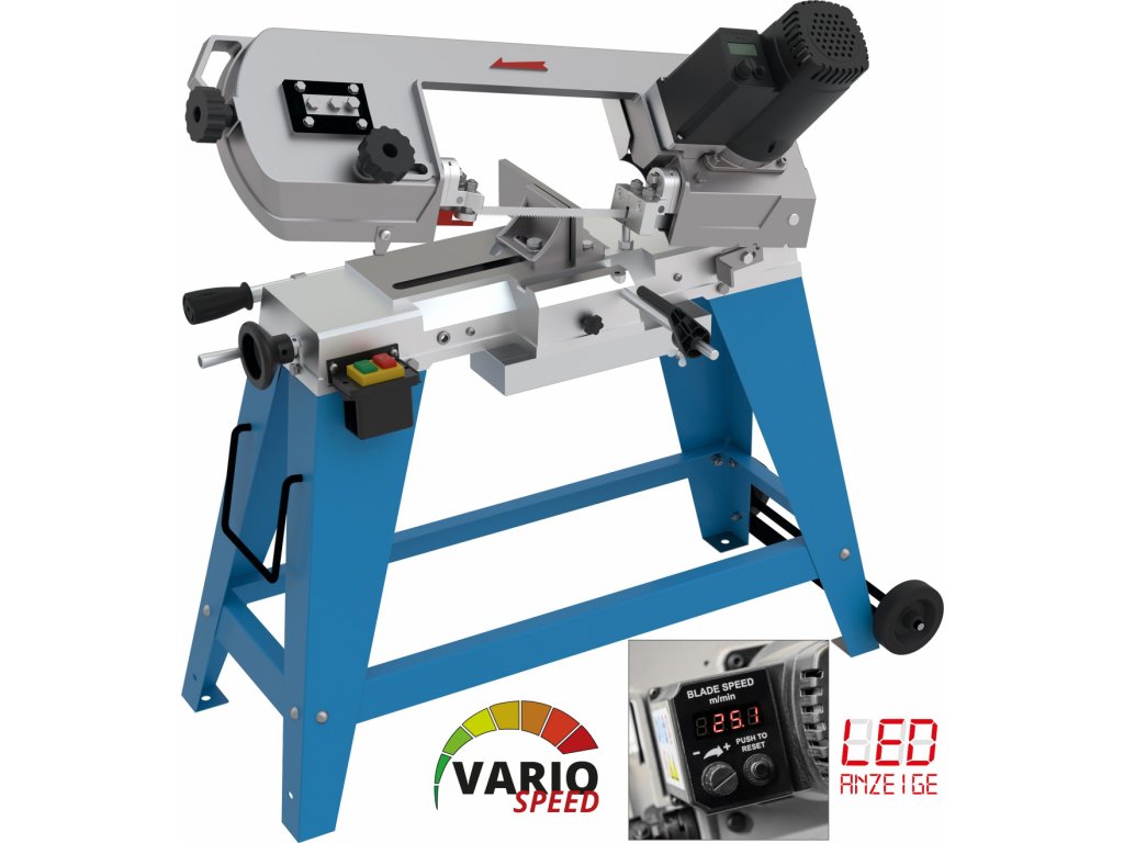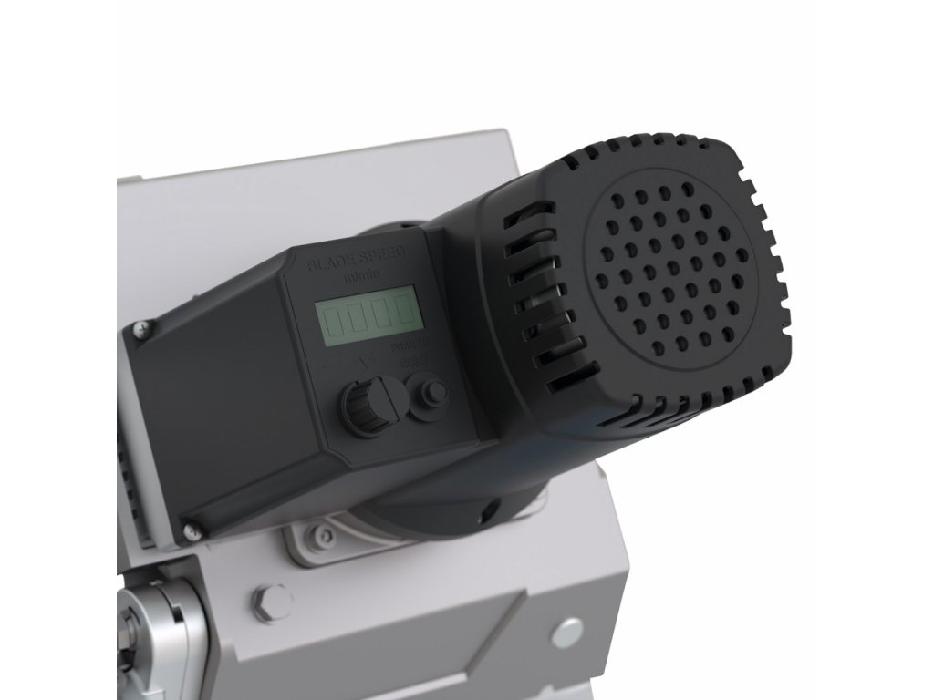 VARIO SPEED - stufenlose Anpassung der Geschwindigkeit des Sägebandes durch die Steuerung (21-44 m/min, inkl. Anzeige des aktuellen Wertes auf dem LED-Display); Klappbarer Sägerahmen (vertikales Schneiden von Werkstücken auf einem zusätzlichen Arbeitstisch).