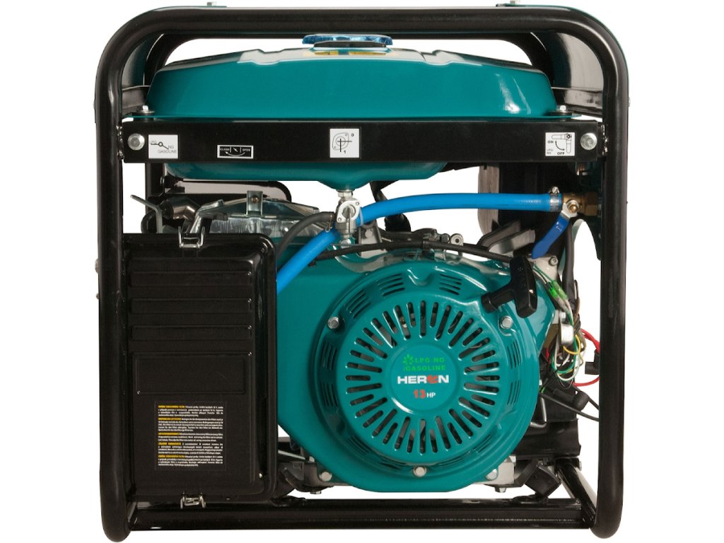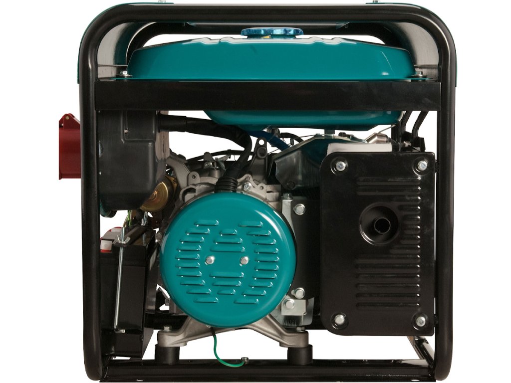 Leistungsfähiges Drehstrommodell, Motor verbrennt Benzin, sowie flüssiges Propan-Butan und gasförmiges Erdgas. Verwendung von LPG/NG-Kraftstoffen schont den Motor und verlängert seine Lebensdauer, weil der Motor beim Verbrennen von sauberem Kraftstoff weniger abgenutzt und besser geschmiert wird. Ausreichende Leistung für die meisten Einphasen- sowie Drehstrommaschinen oder Verbrauchern. Maximal-/Betriebsleistung 1P (230 V) mit Benzin 4,2/4,0 kW, LPG 4,1/3,7 kW und CNG 3,6/3,2 kW. Maximal-/Betriebsleistung 3P (400 V) mit Benzin 5,3/4,8 kW, LPG 5,1/4,5 kW und CNG 4,7/4,3 kW. Der Synchrongenerator erzeugt Wechsel- und Gleichstrom, max. Drehzahl vom Viertakt-Einzylindermotor 4 000 U/min. Schalldruckpegel/Schallleistungspegel 76/108 dB(A).