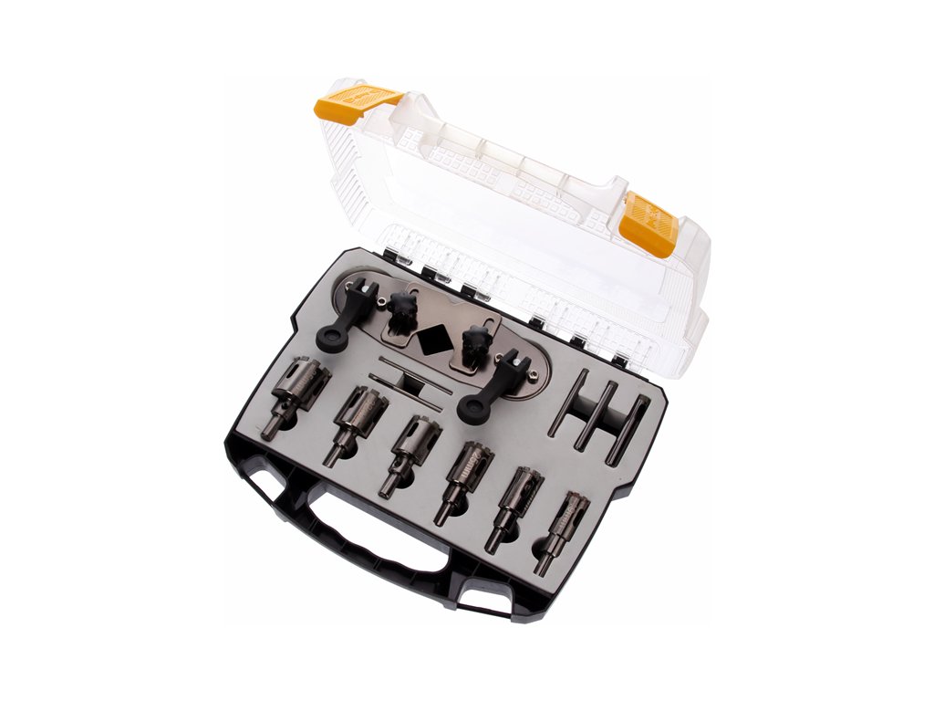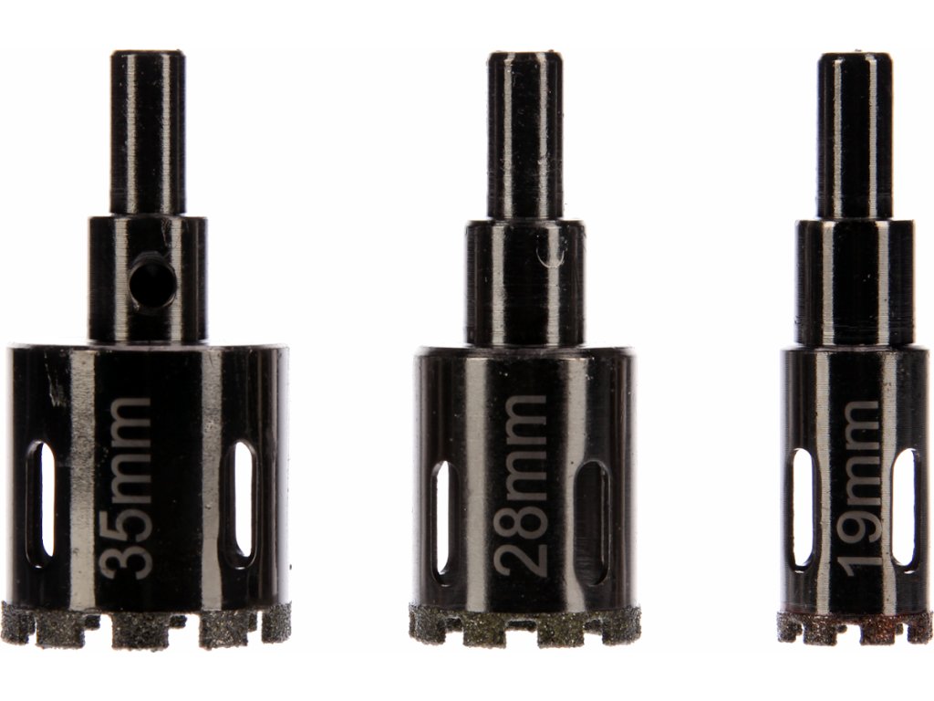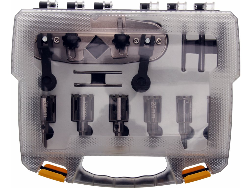 Für Harte Werkstoffe geeignet, z.B. für Fliesen, Pflaster, Keramik, Glas, aber auch Marmor, Granit und Kunststein. Bohrerdurchmesser 5, 6, 8, 10, 12, 19, 22, 25, 28, 32 a 35 mm mit Zylinderschaft.. Inklusive Führungsvorrichtung geliefert, übersichtlich inm Kunststoffkoffer mit Griff gelagert.