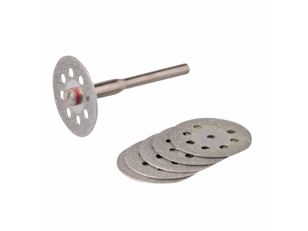 5 Diamanttrennscheiben 22 mm mit 3,1 mm Schaft. Maximale Drehzahl 28.000 U/min.