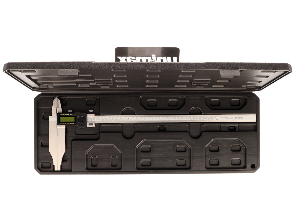 Digitaler Edelstahl-Messschieber mit oberen Backen und Feinverstellung. . Die Backen für Innenraum-Messungen sind abgerundet, die minimale Innenraum-Messung beträgt 20 mm. Umschaltung zwischen metrischen/Zoll-Einheiten, Nullung in jeder beliebigen Position möglich. Grundzubehör: Batterie CR2032 3,0 V, Garantieschein, Bedienungsanleitung, Kalibrierungszertifikat, Holzetui.