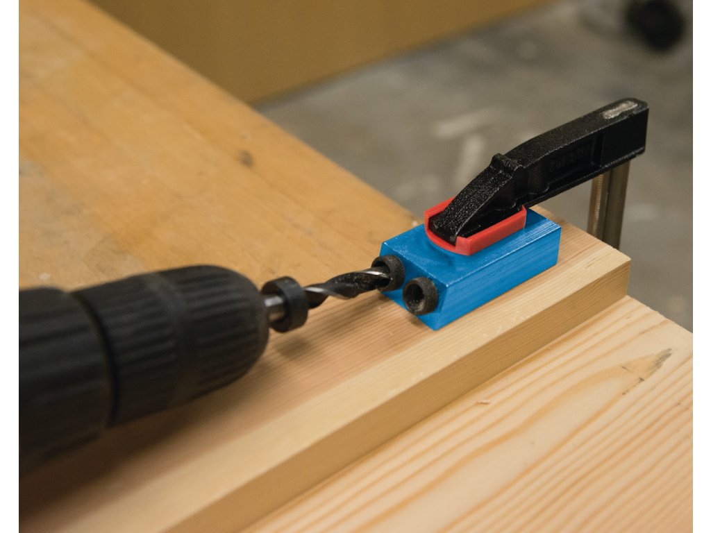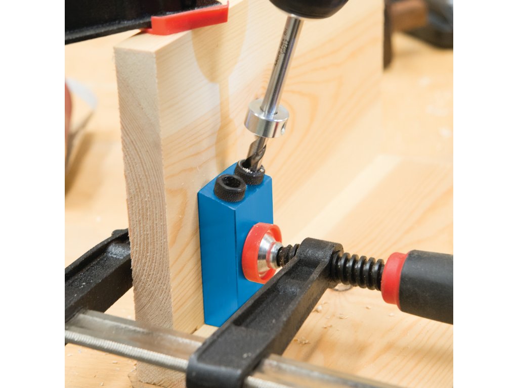 Es schafft starke und präzise Schraub- und Stifttaschenverbindungen. Zum Bohren von Löchern in einem Winkel von 15°. Es enthält 6, 8 und 10 mm Bohrhülsen.