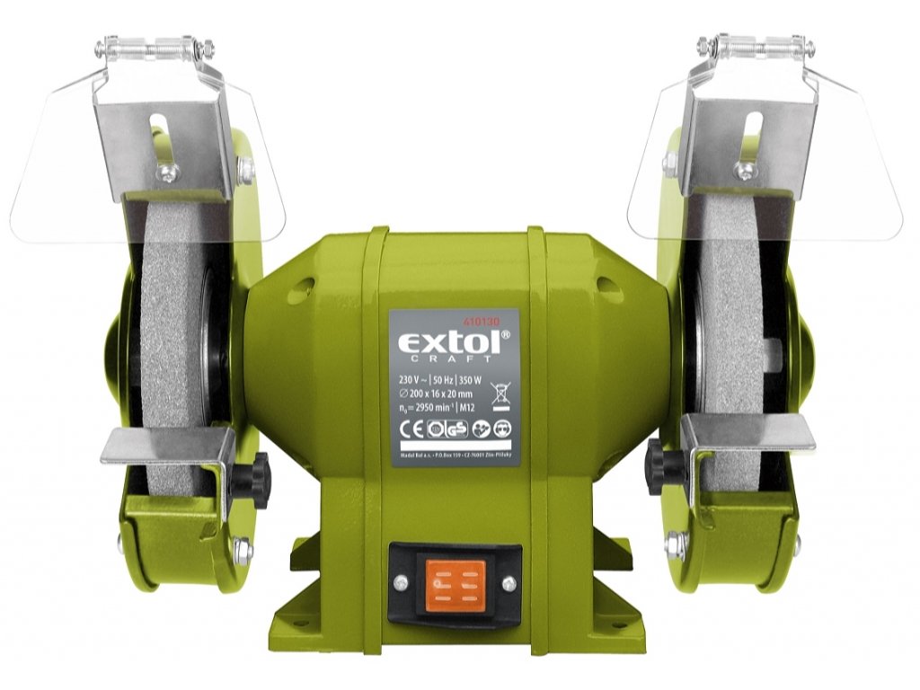 Eine leistungsstarke Doppelschleifmaschine, die für anspruchsvollere Metallbearbeitungen entwickelt wurde. Spannung/Frequenz 230 V/50 Hz, Leistungsaufnahme 350 W, Drehzahl 2.950/min, Scheibendurchmesser 200 × 16 × Breite 20 mm, Scheibengrobheit P36 und P80.