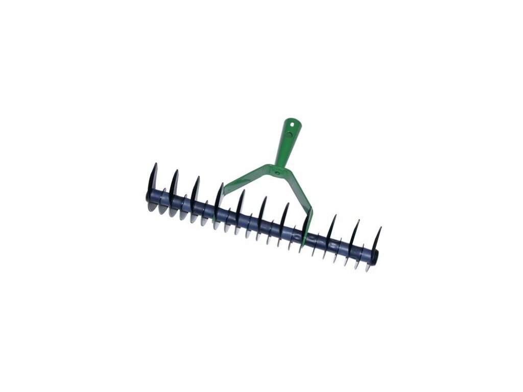 Dieser doppelseitige Belüfter dient zum Ausgraben von Moos und zum Belüften auf kleineren Rasenflächen und eignet sich auch zum Aufbrechen des Substrats vor der Nachsaat.