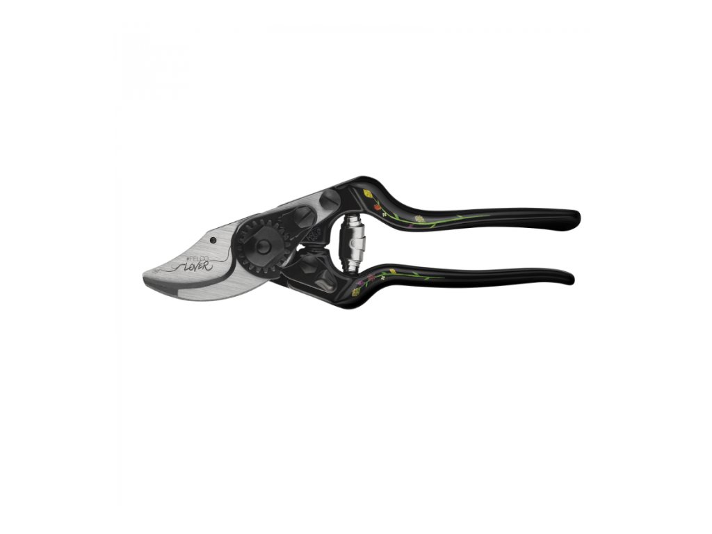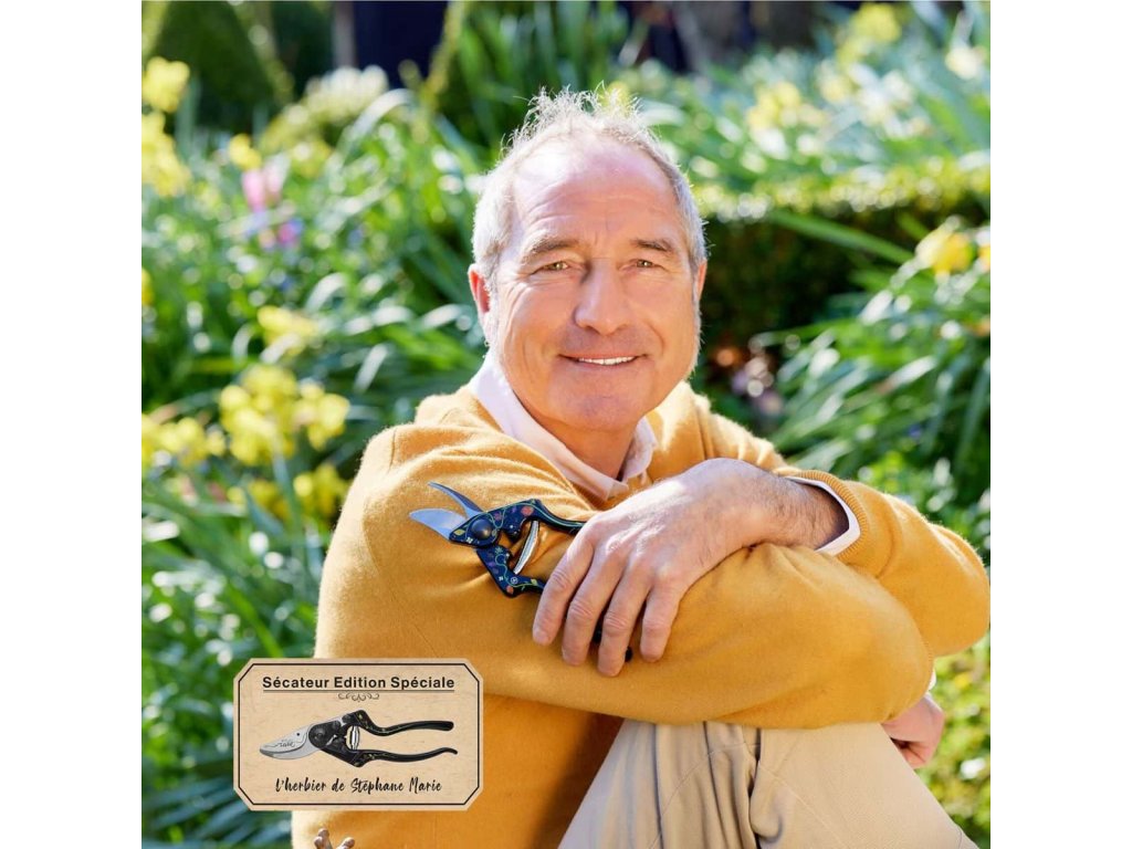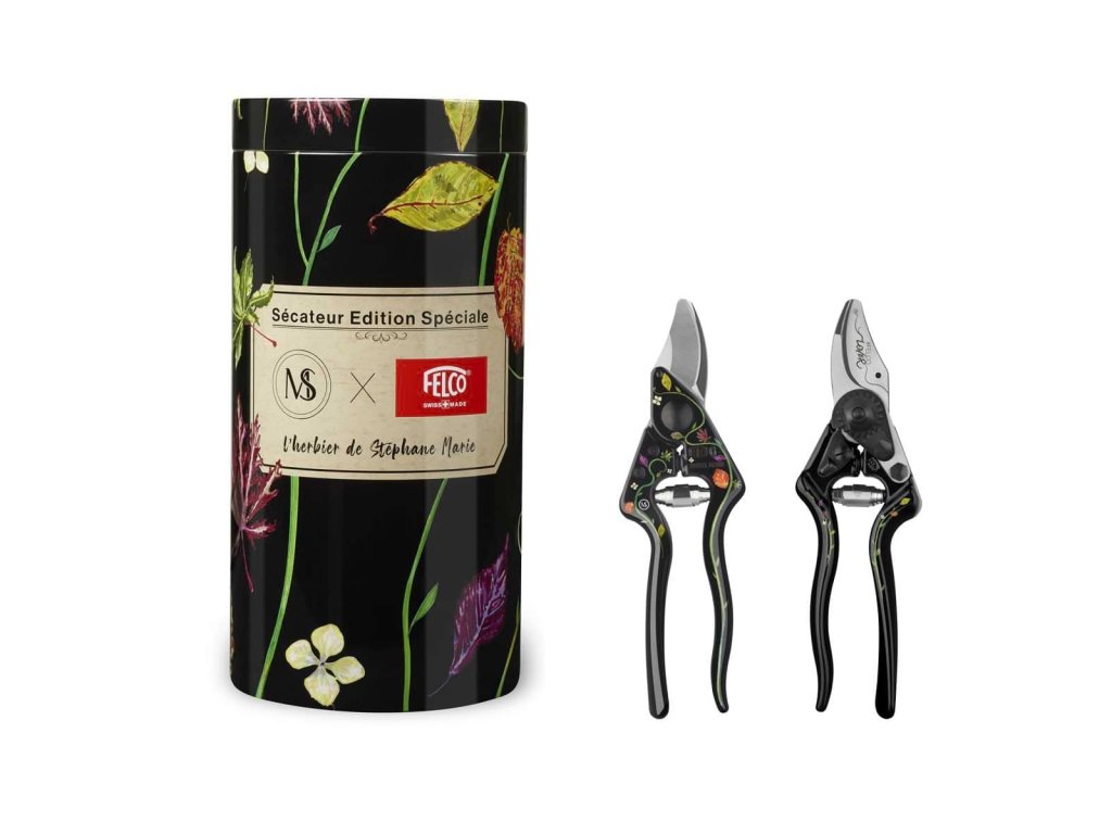 Die berühmte FELCO 14-Schere diesmal inSonderausgabeStéphane Marie. Die Griffe aus metallisiertem Aluminium werden während der Produktion zunächst schwarz eloxiert, dann wird das Motiv aus Stéphane Maries Herbarium mittels UV-Druck auf den schwarzen Griff aufgebracht, und die abschließende Schutzschicht der Griffe ist eine Pulverbeschichtung.