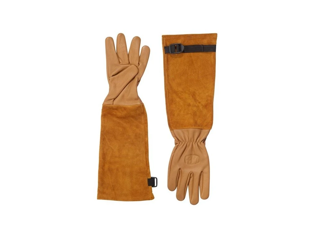 Die aus echtem Rindsledervelours gefertigte Stulpe des Handschuhs bietet Schutz für den Unterarm vor Dornen.