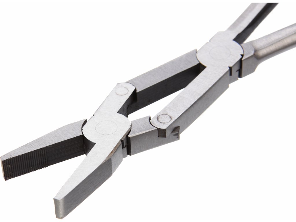 Spezielle Zange, 300 mm lang, mit zwei Gelenken, zum Einsatz in Hohlräumen, schwer zugänglichen und engen Räumen geeignet. Isolierte Griffe und geriffelte Backen.