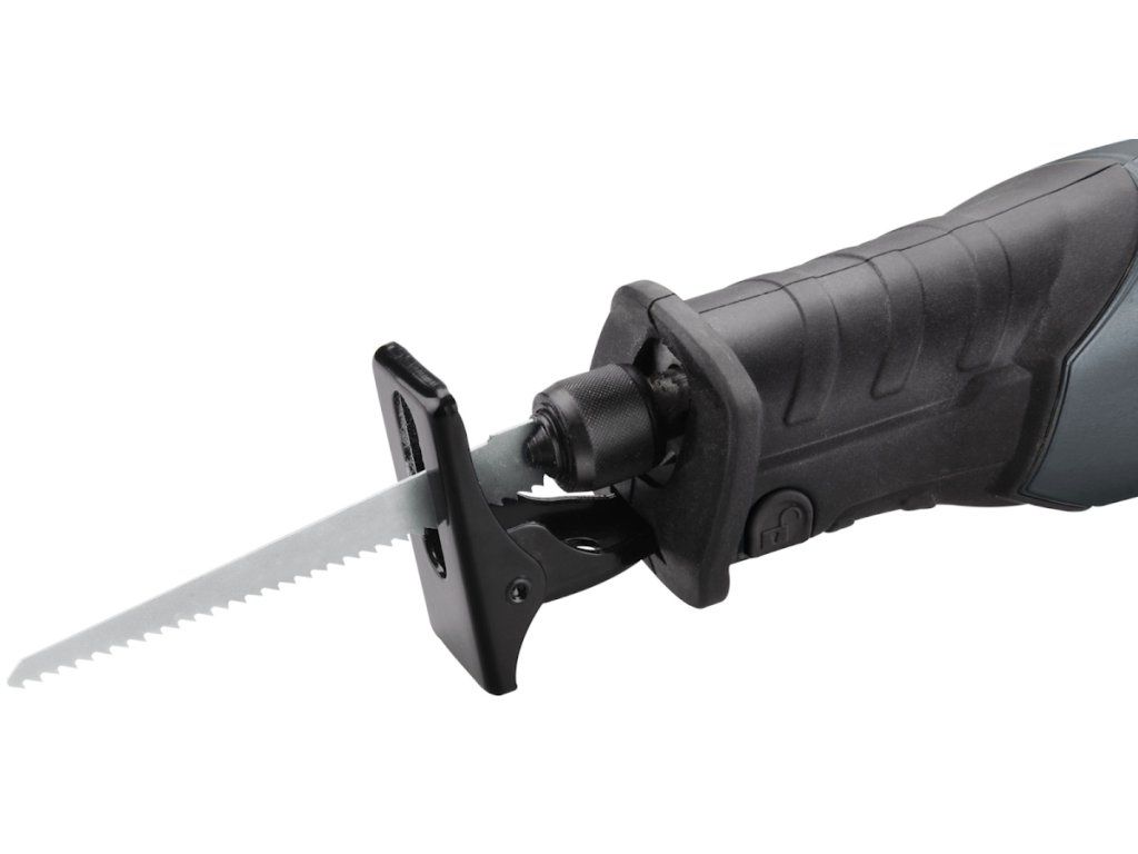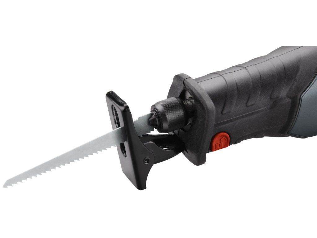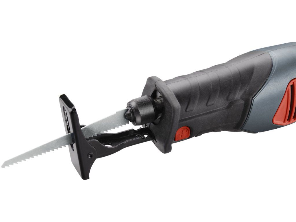 Elektrische Fuchsschwanzsäge mit festem Anschlag zum Schneiden von Holz, Kunststoff, Metall, Bauwerkstoffen und anderen ähnlichen Werkstoffen. Flexibles Sägeblatt für gerade und gebogene Schnitte, sowie Schnitte an schwer zugänglichen Stellen. Das Einschneiden ins Vollmaterial ist beim Einsatz von entsprechenden Bimetall-Sägeblättern möglich. Säge mit gummiertem Griff, stufenlose Schwingungszahlregelung, Drehzahlstabilisierung in belastetem Zustand, das Blatt kann auch um 180° gedreht eingesetzt werden. Max. Schnitttiefe Holz 115 mm, Stahl 5 mm und weiche Metalle 20 mm, Schutzart IP20, Schutzklasse II, Schallpegel 87 dB(A).