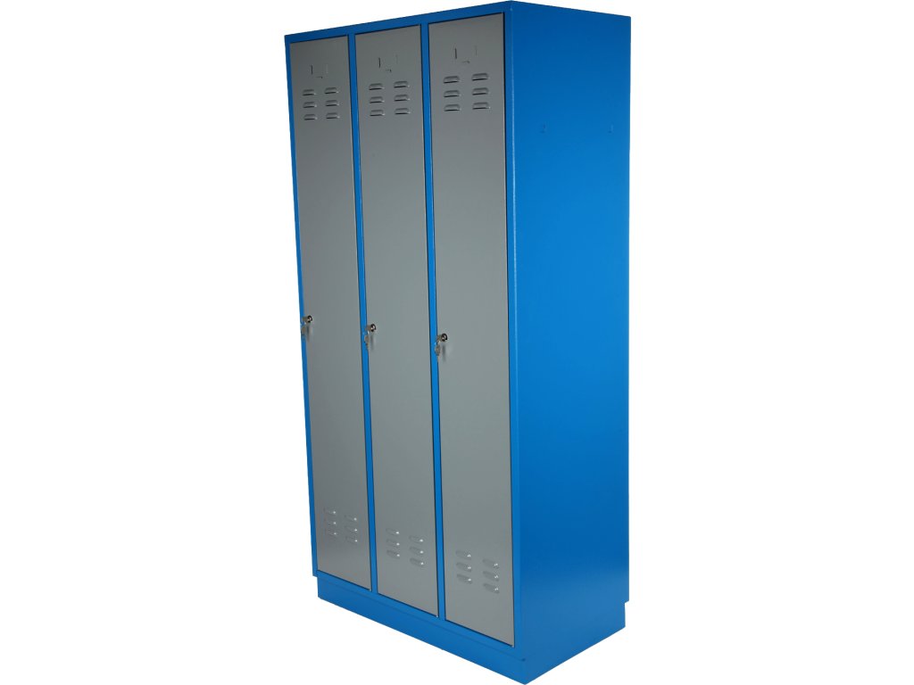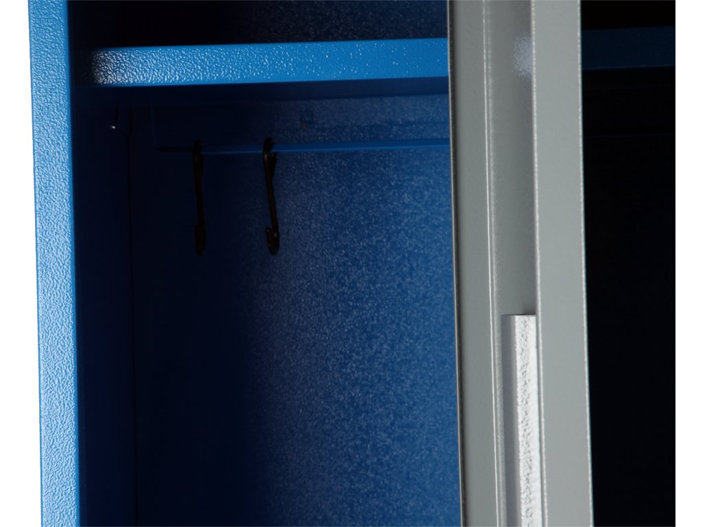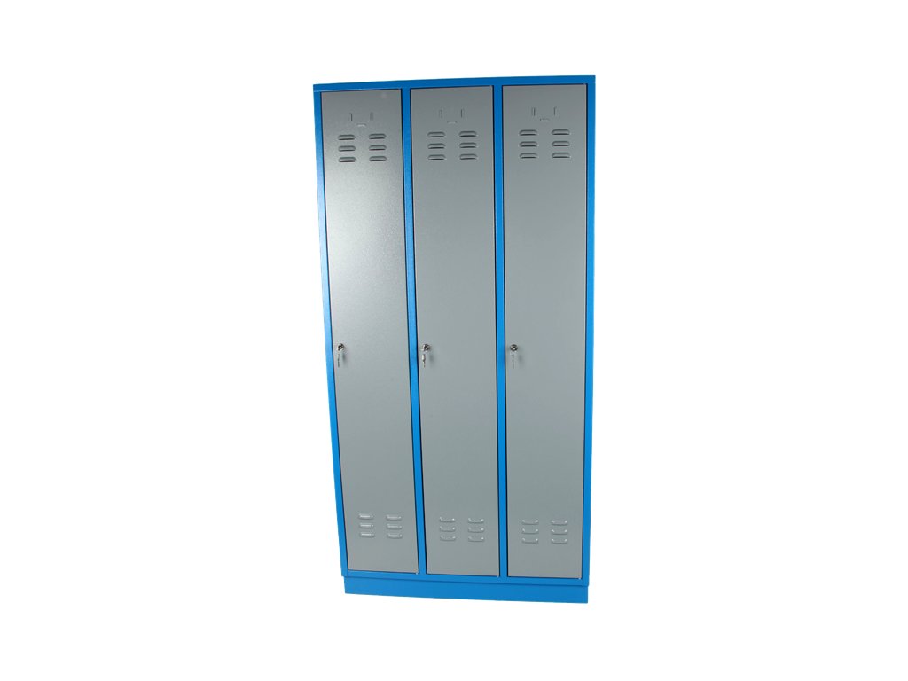 Ganzmetallkonstruktion, zweifarbige Ausführung, 3 verstärkte Türe, oberes Fach mit Stange und 2 × S-Haken in jedem Abteil, Lüftungsöffnungen oben und unten, Namensschilder, Zylinderschloss mit Drehriegel (2 Schlösser), fertig montiert. Maße (B × T × H) 890 × 500 × 1 800 mm.