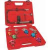 Der Satz ist für die Prüfung von Undichtheiten der Kältekreisläufe mit Druckluft bestimmt. Einsatzfähig bei den meisten Fahrzeugen der Marken: VW, Audi, Mercedes Benz, BMW, Opel, Volvo, Saab, Renault, Citroen, Peugeot, Fiat, Alfa Romeo, Jeep, Rover, Ford GM, Chrysler, Nissan, Mitsubishi, Mazda, Honda, Suzuki, Toyota, Isuzu, Infiniti, Lexus. Handpumpe, Satz von Testköpfen und Manometer, alles in einem praktischen Koffer aufbewahrt.