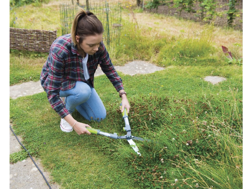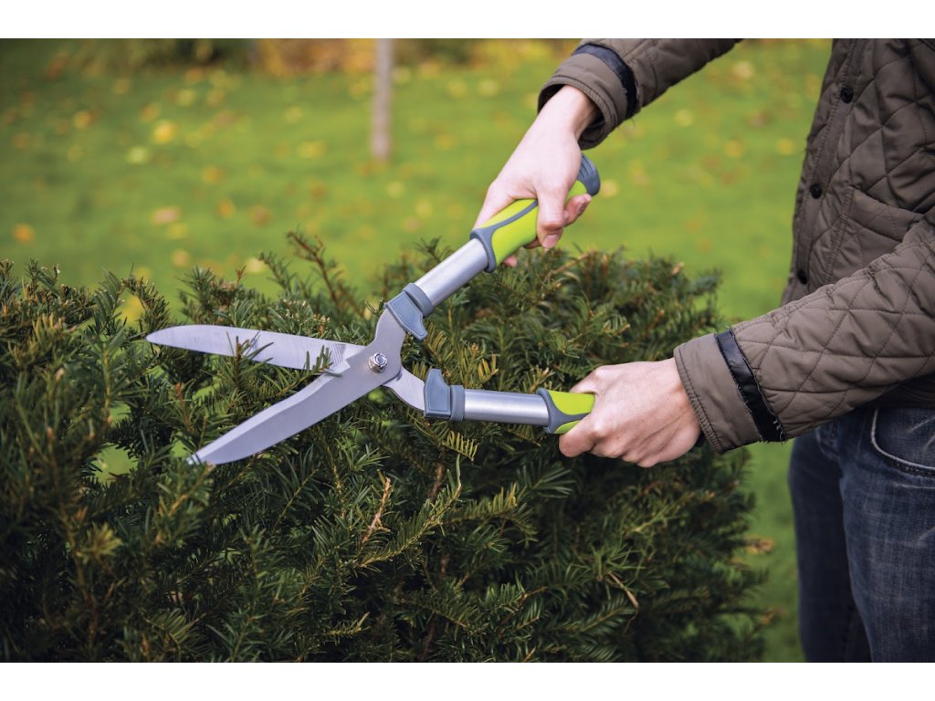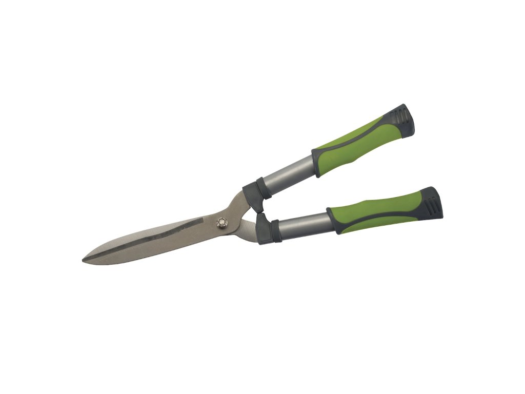 Gartenschere zum Schneiden von Hecken etc. Griffe aus ovalen Stahlrohren, gummiert, Kunststoff, rutschfeste Hülsen.