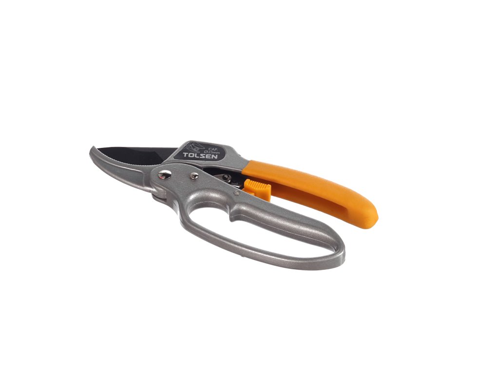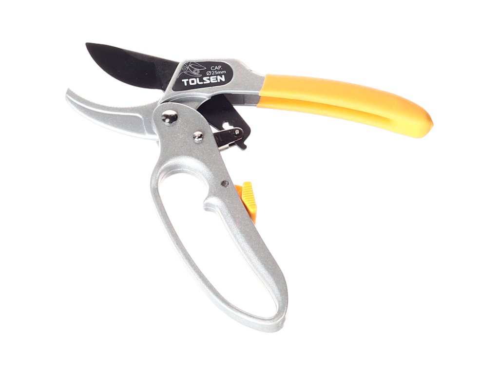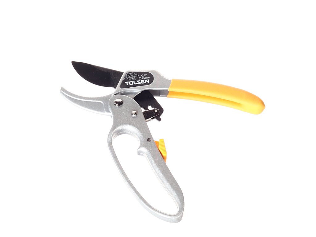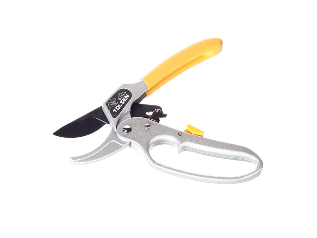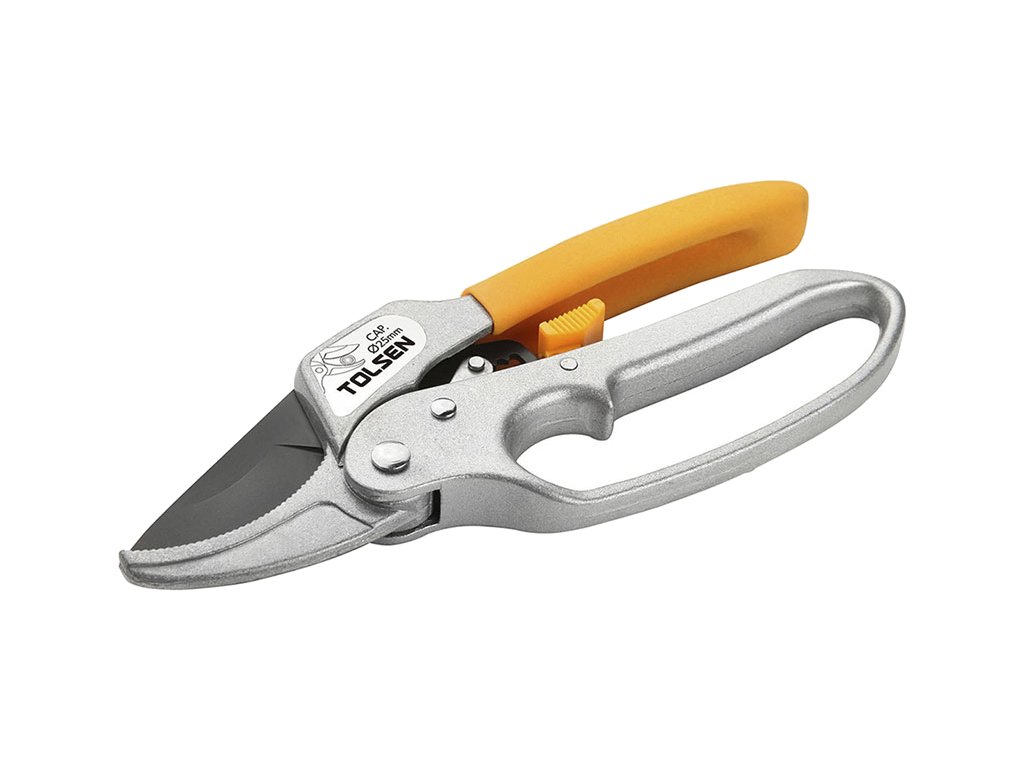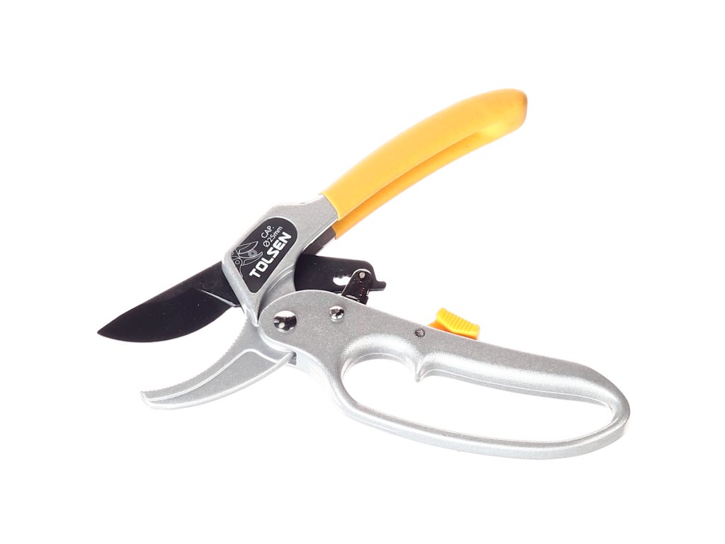 Hochwertige Gartenschere zum Beschneiden von Pflanzen, Büschen und Bäumen. Einfaches Schneiden dank einer speziellen Übersetzung bis Ø 25 mm. Gehäuse aus Al-Legierung. Teflonbeschichtete Schneiden. Gesamtlänge 200 mm. Im Blister verpackt.