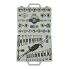 Metrische Ringgewindeschneider: 6 × 1,0; 6 × 0,75; 8 × 1,25; 8 × 1,0; 10 × 1,5; 10 × 1,25; 12 × 1,75; 12 × 1,5; 14 × 2,0; 14 × 1,5; 16 × 2,0; 16 × 1,5; 18 × 2,5; 18 × 1,5; 20 × 2,5; 20 × 1,5; 22 × 2,5; 22 × 1,5; 24 × 3,0; 24 × 1,5. Die Abmessungen von Gewindelochschneidern sind mit den Ringen identisch. Der Satz enthält noch: Windeisen, Schraubendreher zum Ringanziehen, Reduziereinlagen für kleinere Ringen. Im Koffer geliefert.