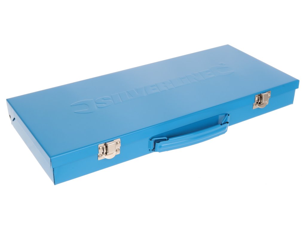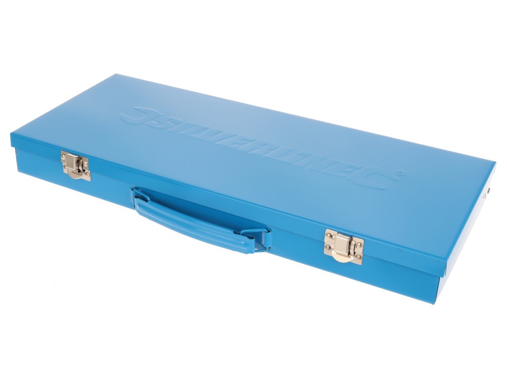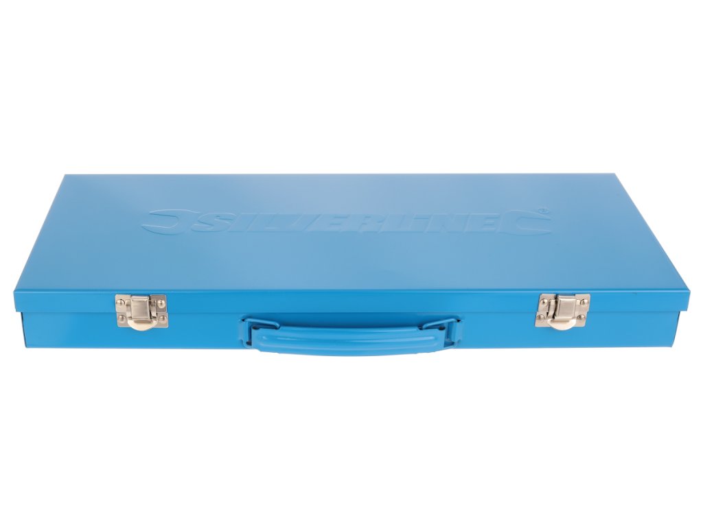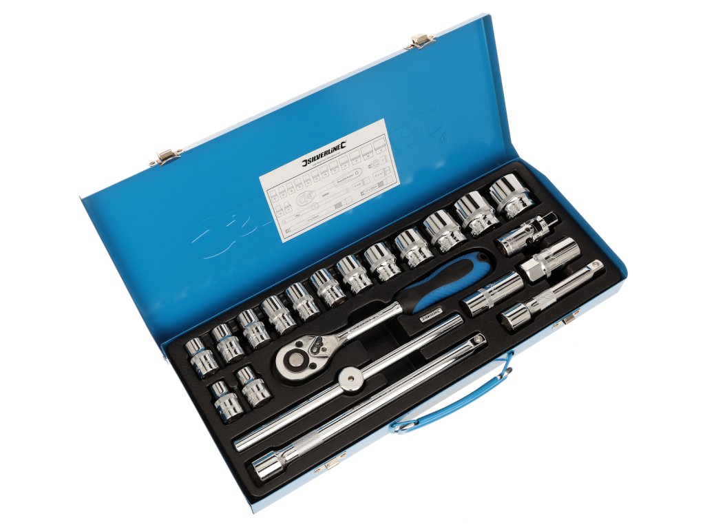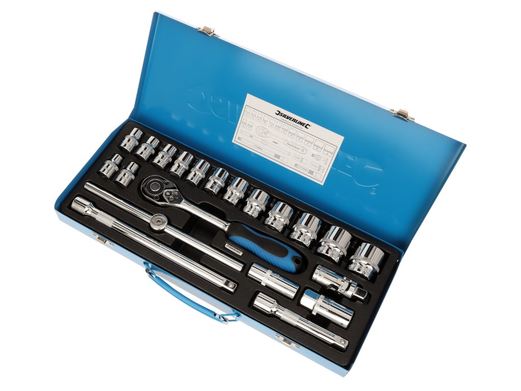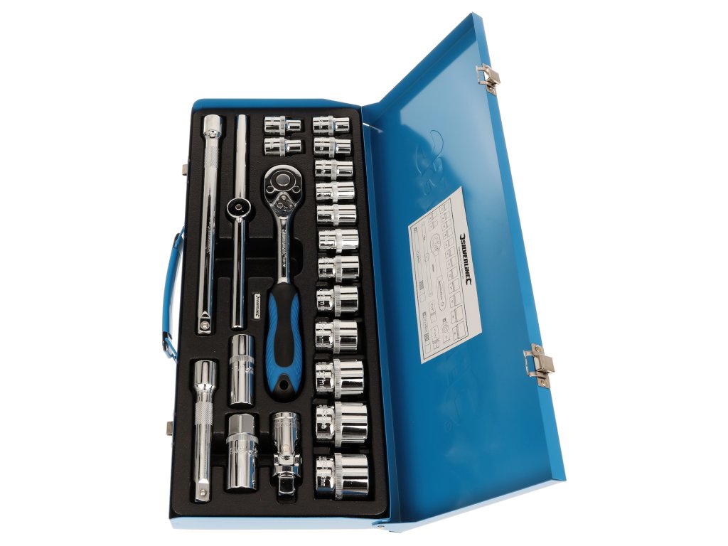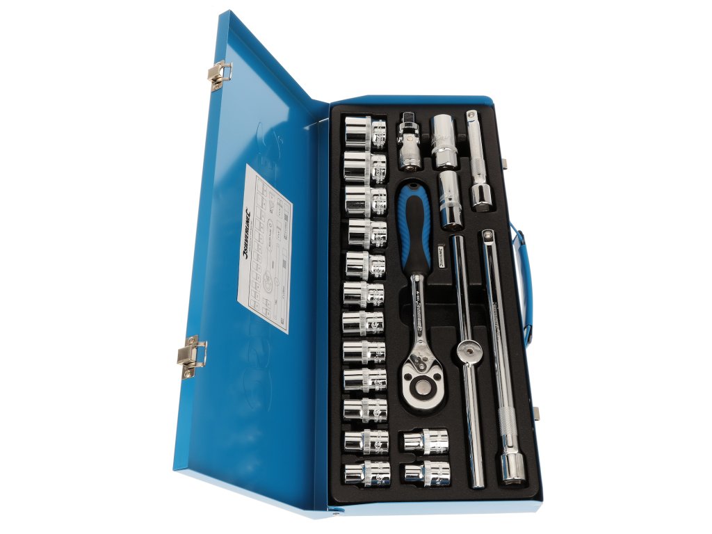 Neben der 1/2"-Ratsche und dem Gelenk enthält das Set Steckschlüssel: 10, 11, 12, 13, 14, 15, 16, 17, 19, 22, 24, 27, 30 und 32 mm, Zündkerzenschlüssel 13/16" und 5/8", Verlängerung 125 und 150 mm.