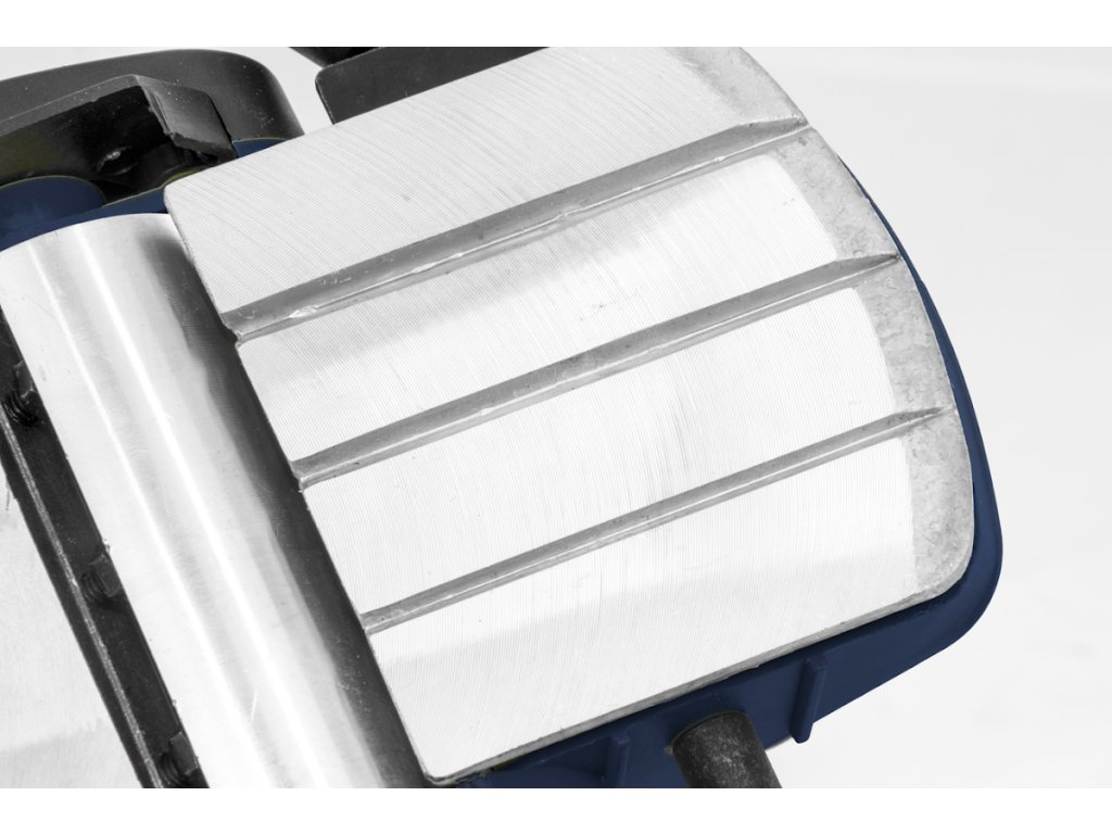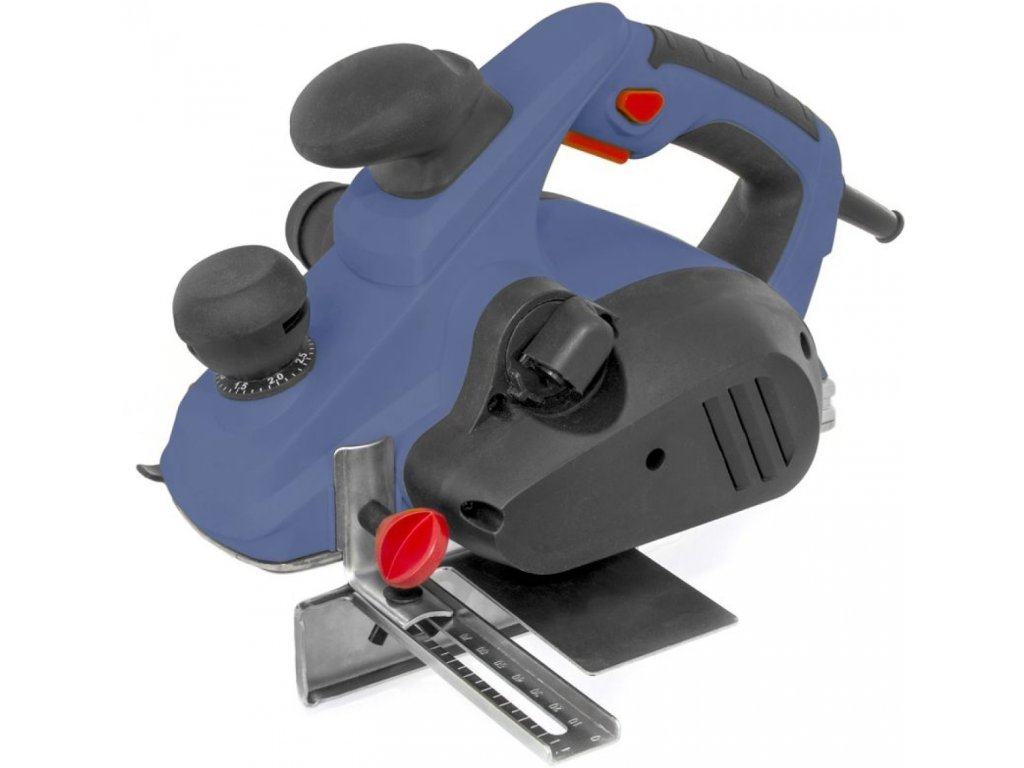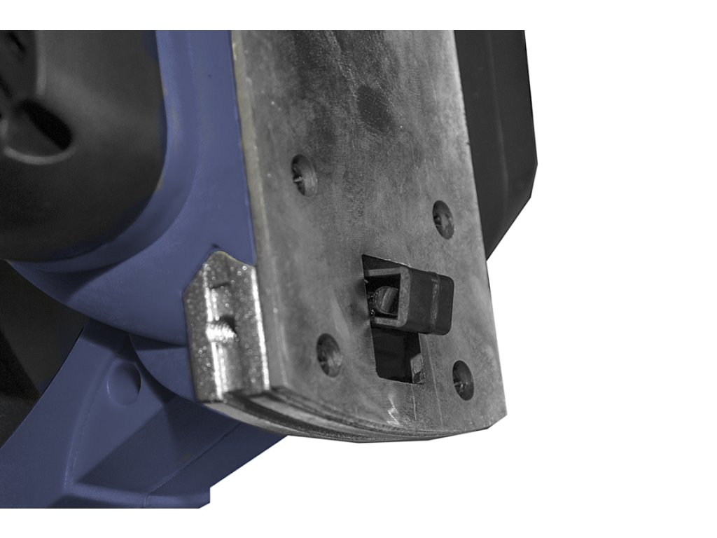 Ausführung: ergonomisch geformte Griffe mit Dämpfungseinlagen, Längs-/Klappanschlag, doppelter Späneabzug (→ beidseitiger Späneauswurf), Parkschuh (→ sichere Aufbewahrung des Hobels ohne Beschädigung von Holz/Messern).