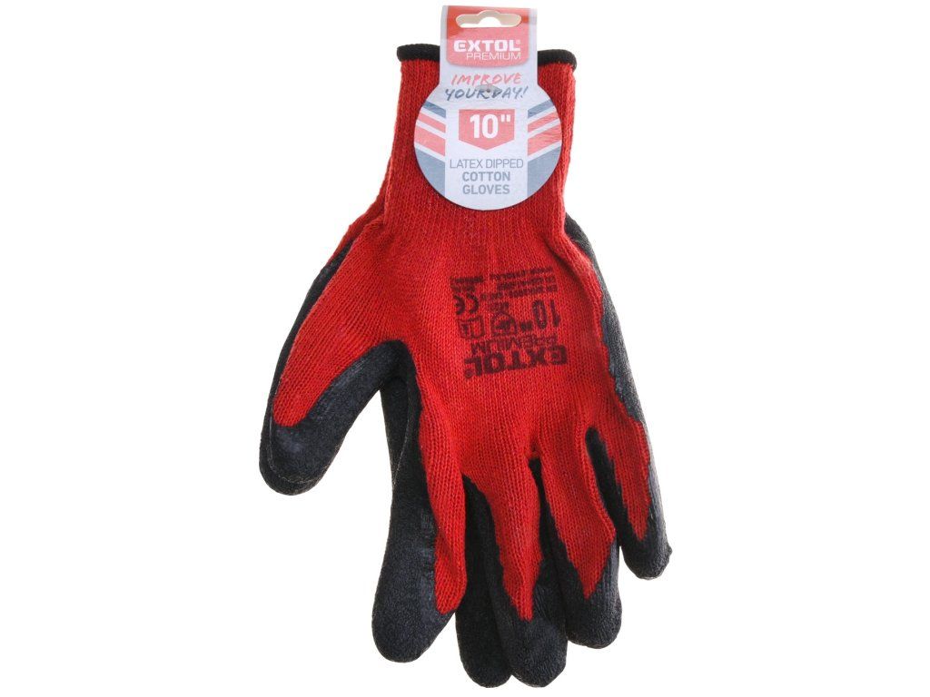 Rotschwarz, nahtlose Ware aus Baumwolle (65 %) und Polyester (35 %), Handfläche und Finger mit starker Latex-Schicht, Antirutsch-Oberfläche, elastische Manschette, gemäß EN 388, CE, Schutz gegen mechanische Gefahren 4121, zum Schutz gegen mechanische Einflüsse bei der Handhabung mit Teilen in trockener und nassen Umgebung bestimmt. Größe 10".