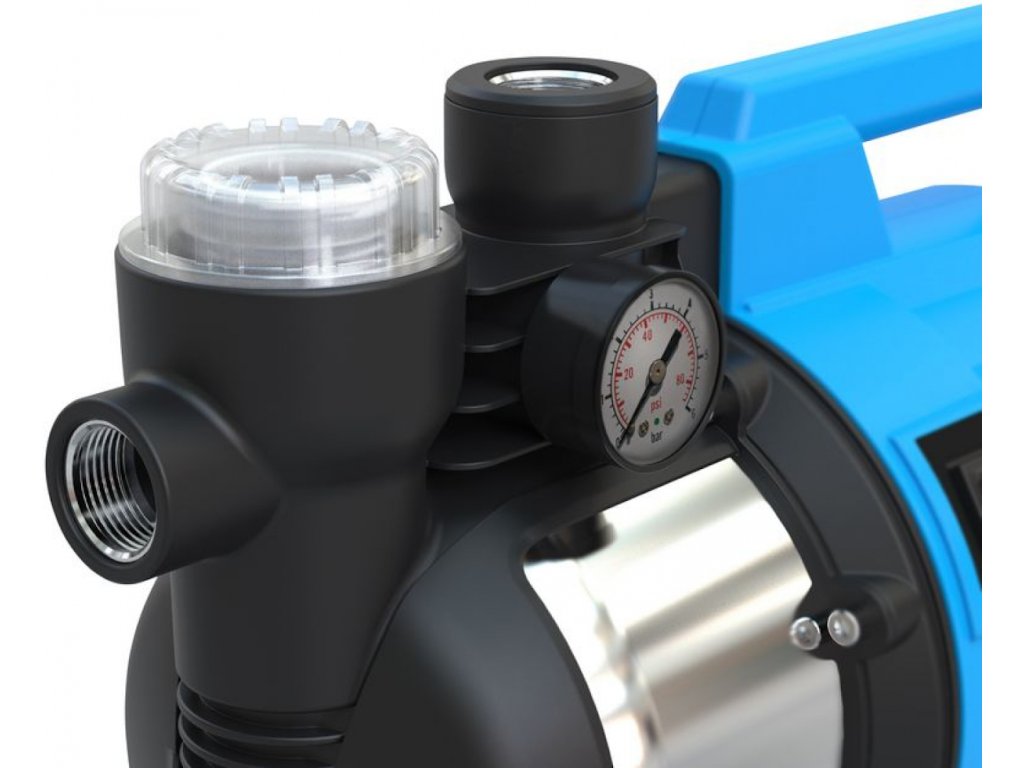 Integrierter Druckschalter mit Trockenlaufschutz; eingebauter Wasserfilter, der verwendet wird, um Sand oder andere (organische) Verunreinigungen, die im gepumpten Wasser enthalten sind, abzuscheiden und zurückzuhalten.