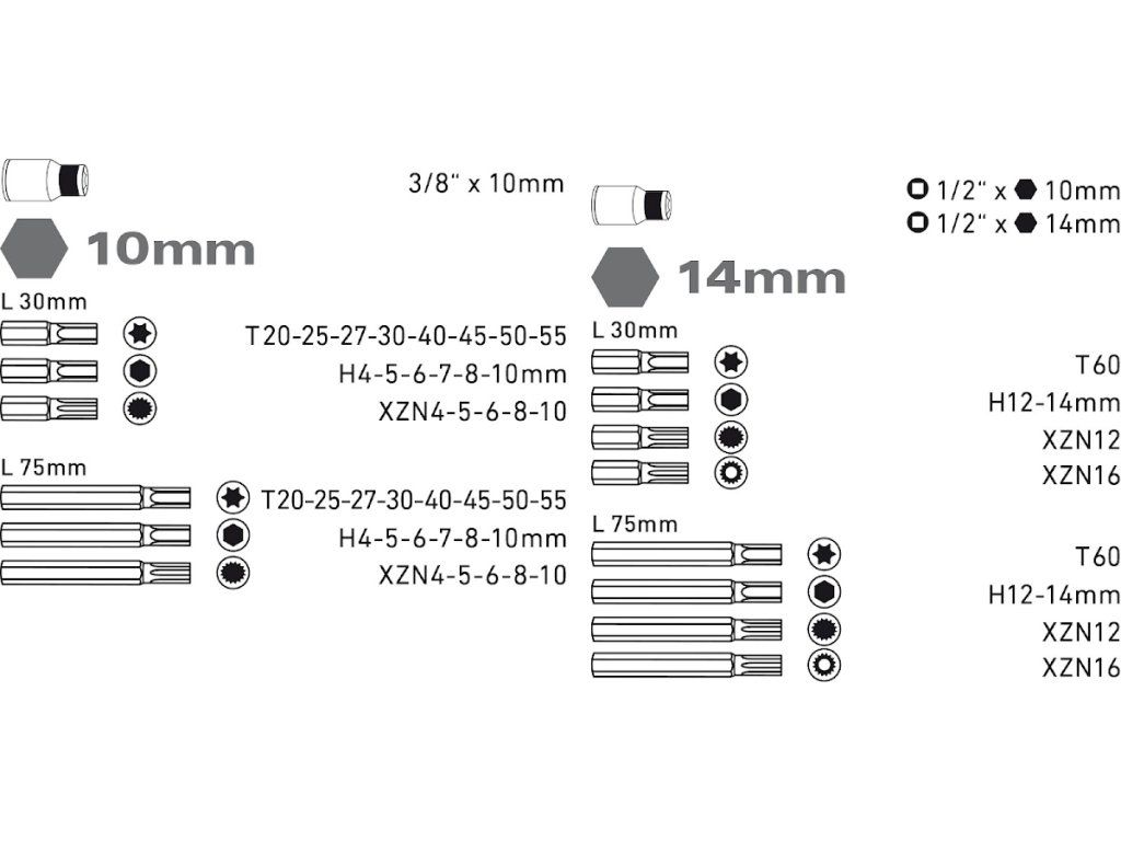 Spitzen- Steckköpfe: 10 mm Steckspitzen (L30 mm): T20 - 25 - 27 - 30 - 40 - 45 - 50 - 55, H4 - 5 - 6 - 7 - 8 - 10 mm, XZN4 - 5 - 6 - 8 - 10; 14 mm(L30 mm): T60, H12 - 14 mm, XZN12, XZNTa16