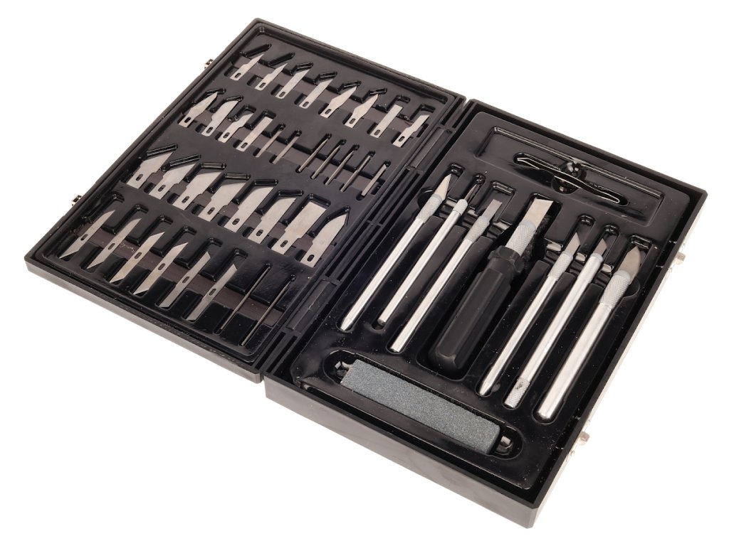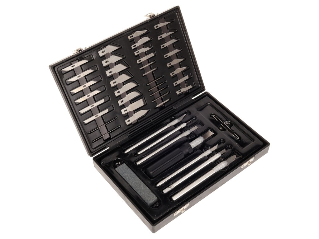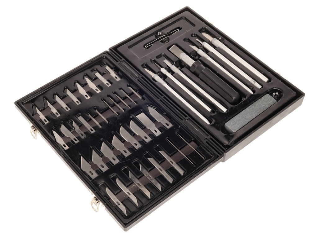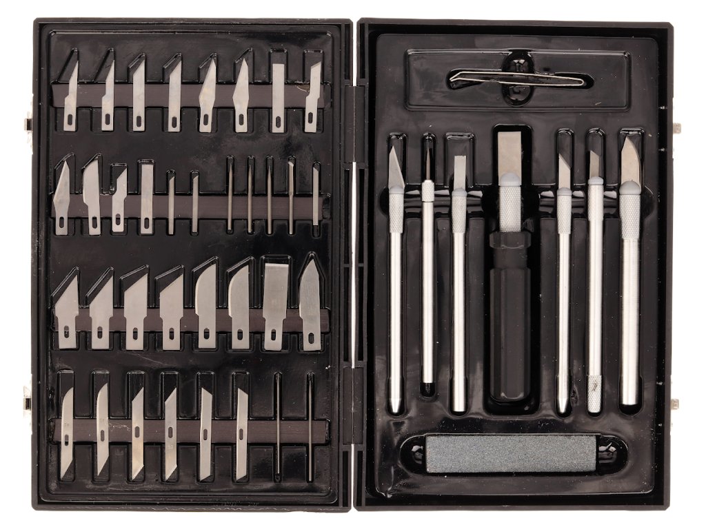 Aluminium-Griffe. Sehr scharfe, leicht austauschbare Klingen für feines, präzises und anspruchsvolles Arbeiten. Kunststoffkoffer mit integriertem Magnetgürtel zur Aufbewahrung von Klingen. Es enthält 7 Griffe, 11 Klingen in verschiedenen Formen, 5 Nadeln und einen Schleifstein.
