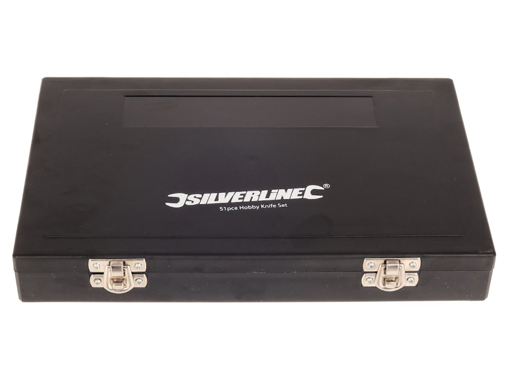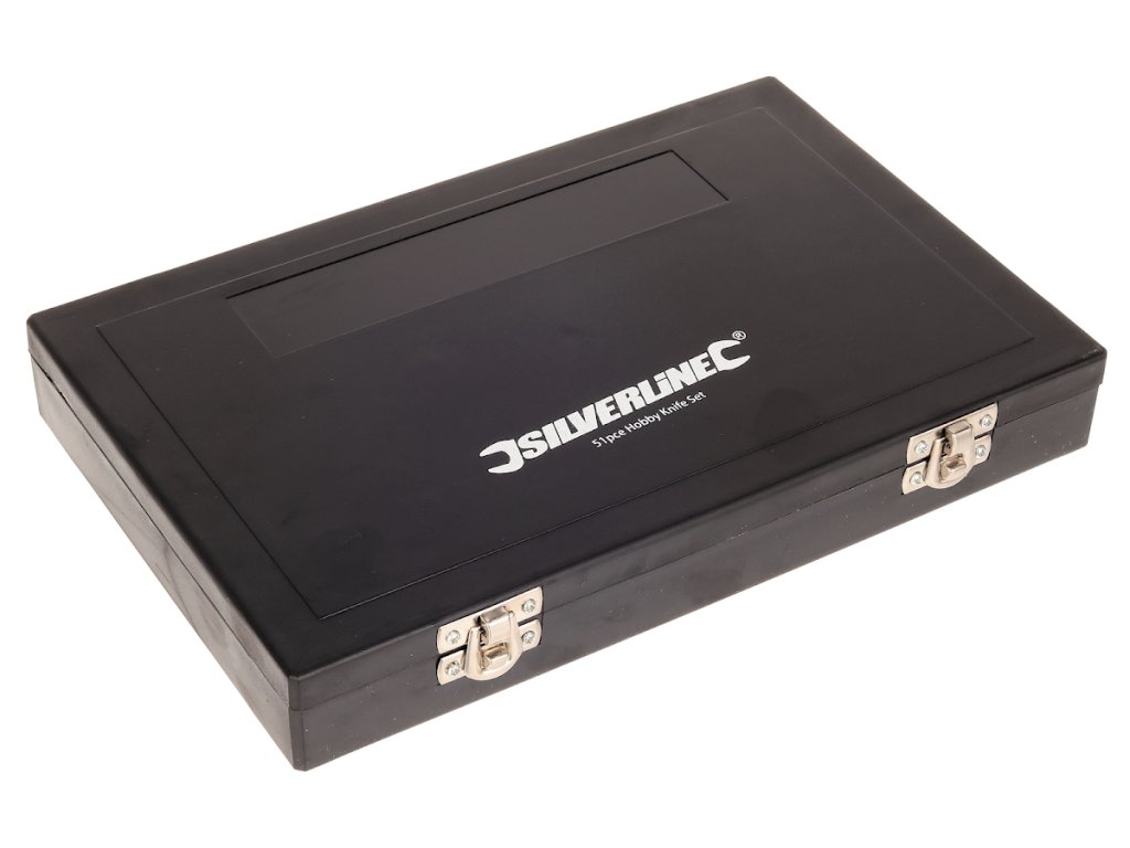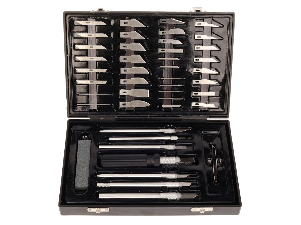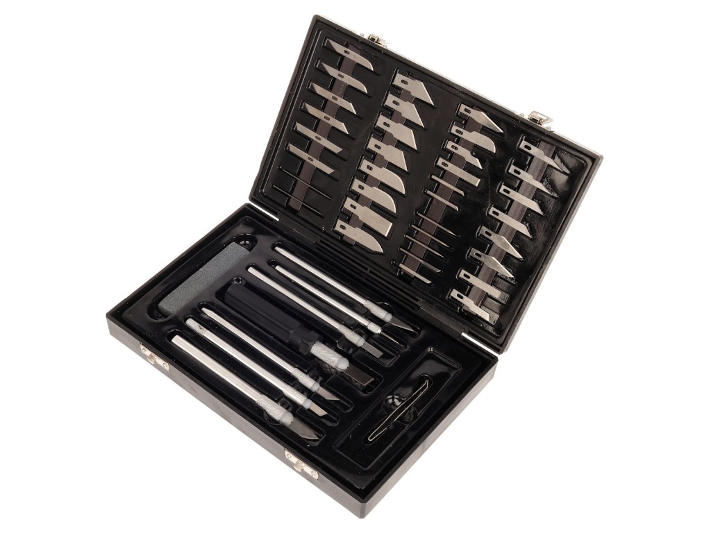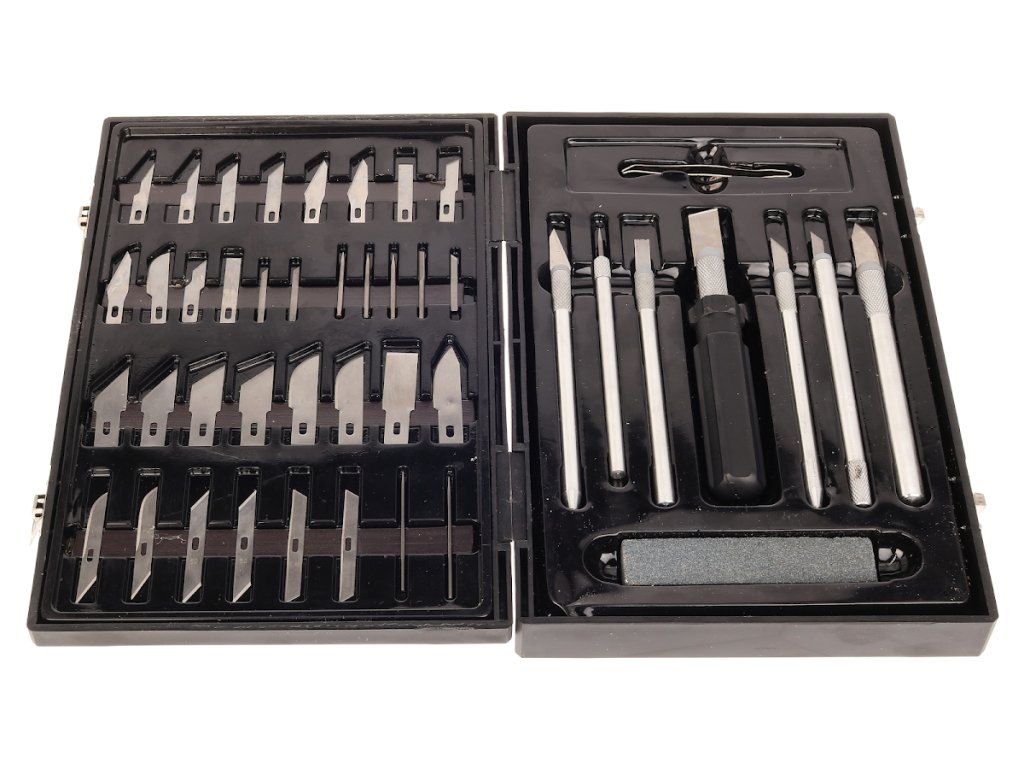 Aluminium-Griffe. Sehr scharfe, leicht austauschbare Klingen für feines, präzises und anspruchsvolles Arbeiten. Kunststoffkoffer mit integriertem Magnetgürtel zur Aufbewahrung von Klingen. Es enthält 7 Griffe, 11 Klingen in verschiedenen Formen, 5 Nadeln und einen Schleifstein.