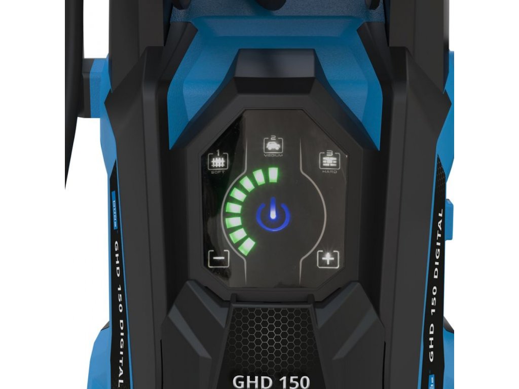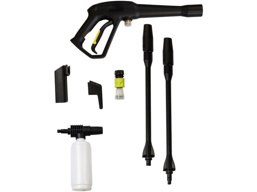 Zubehör: verstellbare VARIO-Düse, Grobschmutzschneider, Schaumsprüher mit 0,25 l Behälter, 5 m Druckschlauch, Wasserfilter.