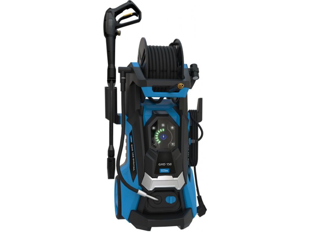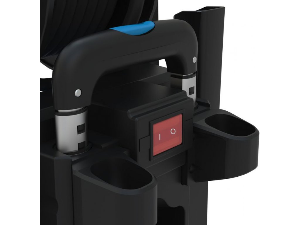Hochdruck-Spritzpistole mit zwei Düsen, Druckschlauchtrommel, Teleskopgriff und Rädern zum bequemen Bewegen der Spülmaschine von Ort zu Ort.