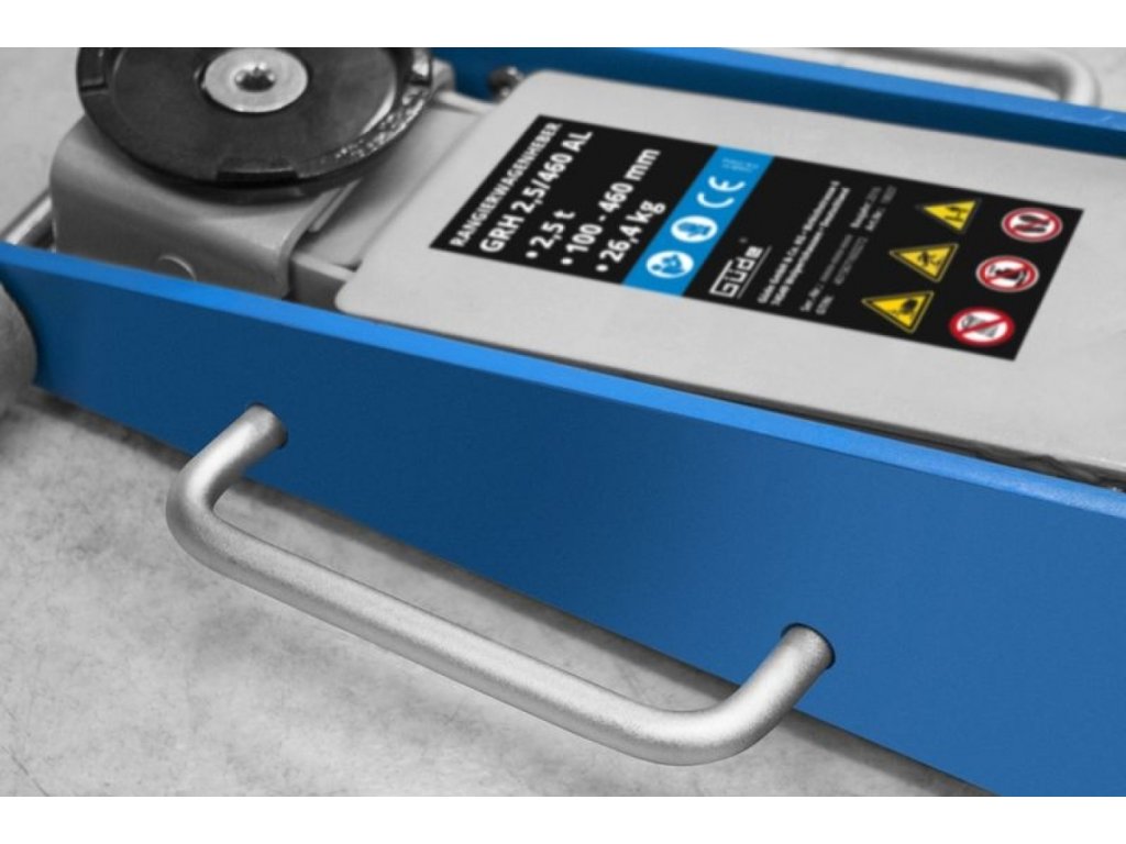 Tragarmhub 100 - 460 mm, profilierte Lastplatte (→ Durchmesser: 110 mm; inkl. Gummiauflage), sanftes Absenken der Last durch Drehen des Ablassventils.