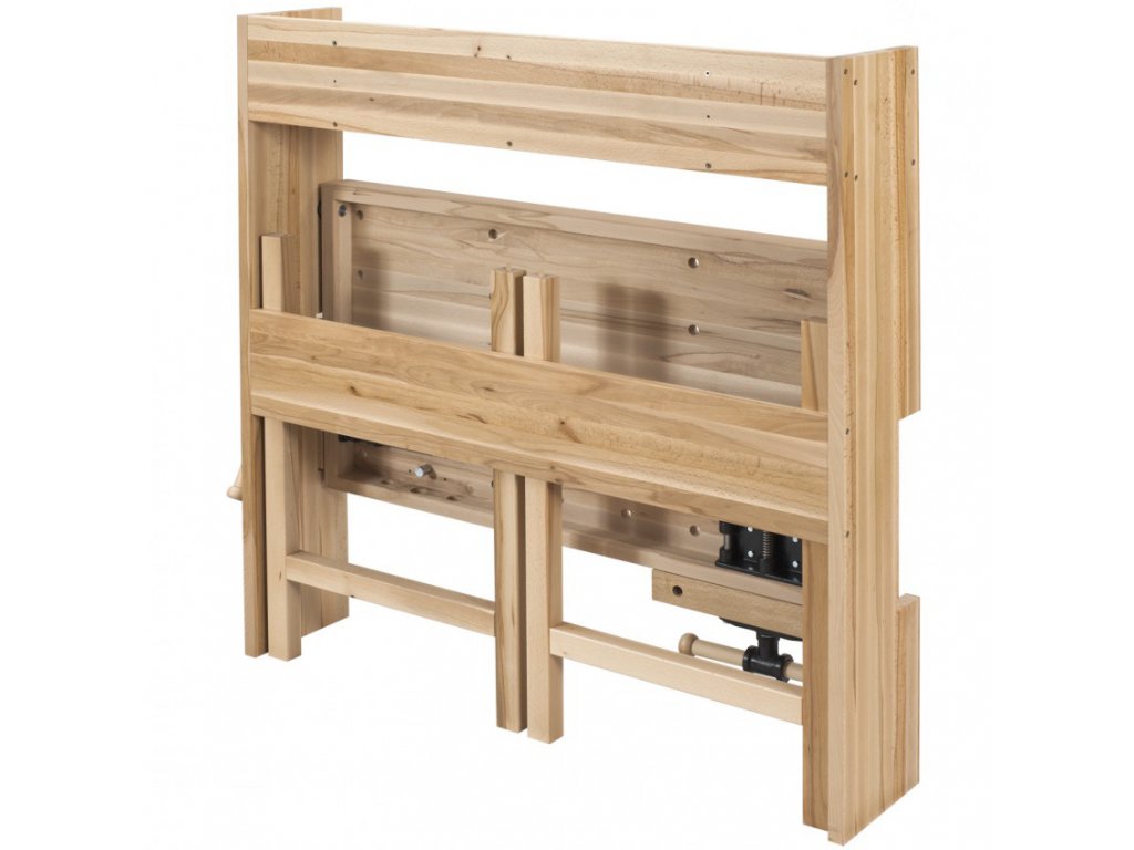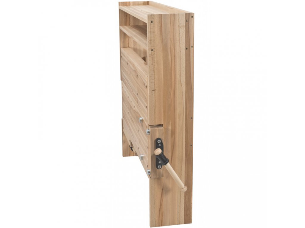 Das klappbare Hobelmodell findet Anwendung in vielen Situationen, in denen es notwendig ist, einen voll funktionsfähigen Arbeitsplatz auch an einem Ort mit begrenztem Platz zu schaffen, oder an dem der Hobel nur gelegentlich verwendet wird. Lassen Sie sich nicht von gelegentlichem Gebrauch täuschen. Folding hat eine 30 mm dicke Platte, zwei Schraubstöcke und die Gesamtkonstruktion garantiert mehr als ausreichende Festigkeit und Stabilität. Schraubstöcke können dank vorgebohrte Löcher sowohl als rechte wie als linke Variante verwendet werden. Die Arbeitsfläche kann mit einer einfachen Modifikation in den Schrankkörper eingeklappt werden, erfordert dann nur 25 cm Tiefe und ermöglicht den Durchgang auf engerem Raum.