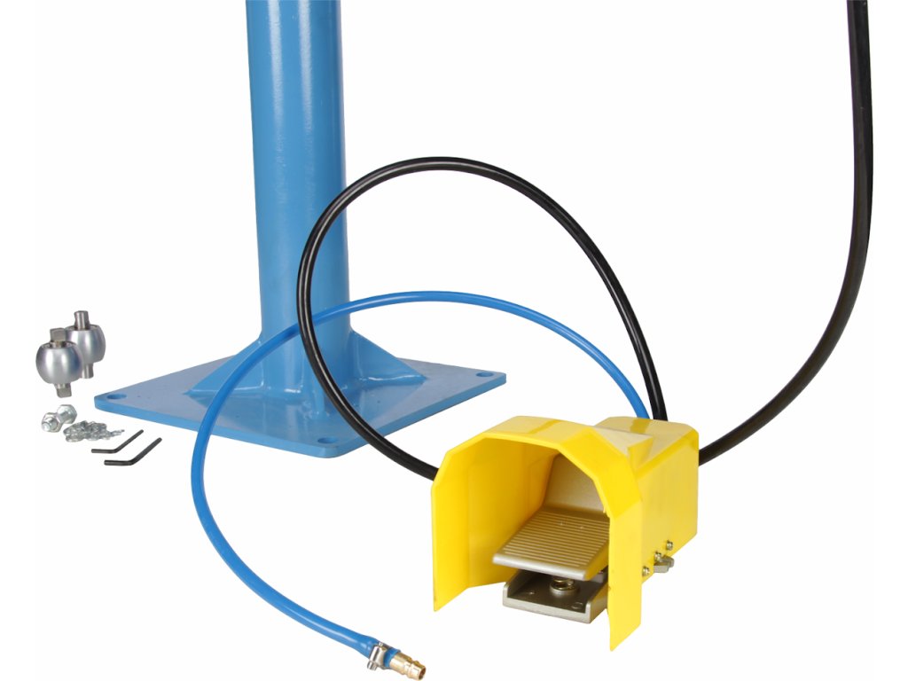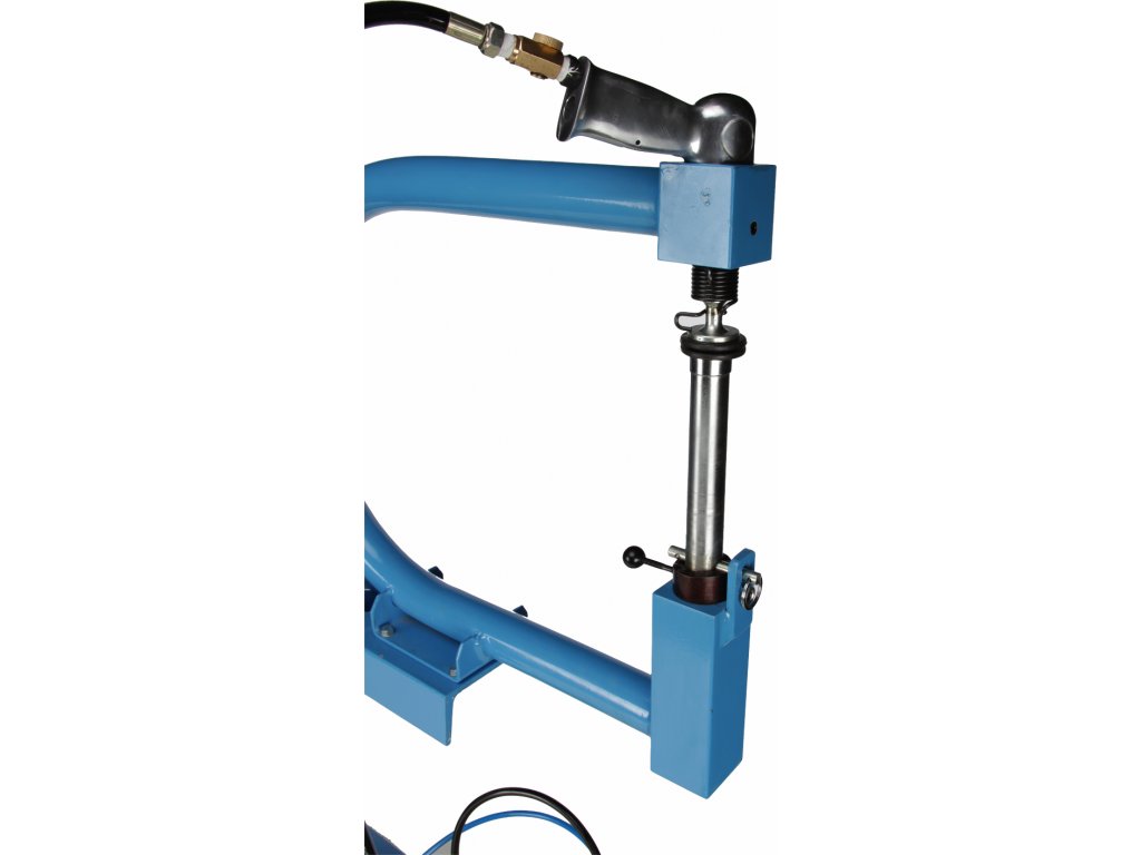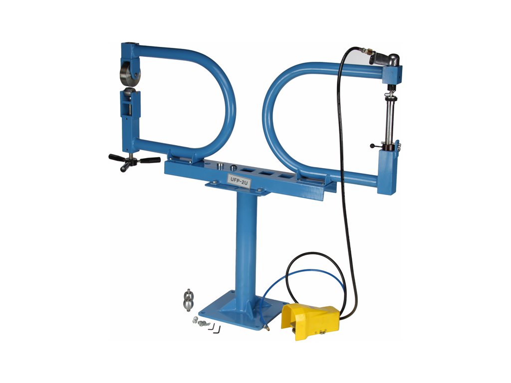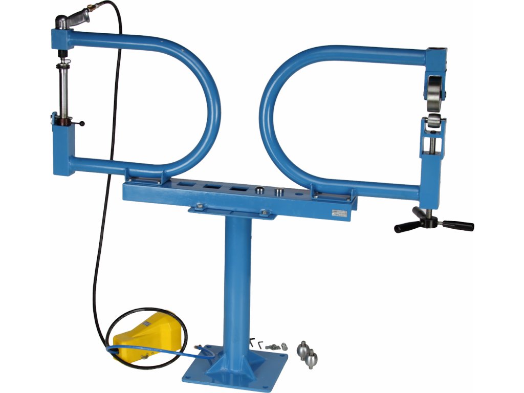 Kombination einer Walz- und einer Blechklopfvorrichtung zur Produktion und Reparaturen von Formteilen aus Blech z.B. für Fahrzeuge und Motorräder. Das Treiben in grobe Form wird mit einem pneumatischen Hammer mit Fußbetätigung realisiert. Arbeitsdruck 3,5 – 7 bar, unterer Amboß höhenverstellbar. Zur anschließenden Glättung dient die Walzmaschine mit oberem Werkzeug, ø 114 × 38 mm, und wechselbaren unteren Werkzeugen mit Breite 38 mm und Durchmesser 48 mm mit Rundungsradien 85, 41 und 31 mm. Zum Luftanschluss muss der Einschub ES6S gekauft und gewechselt werden.