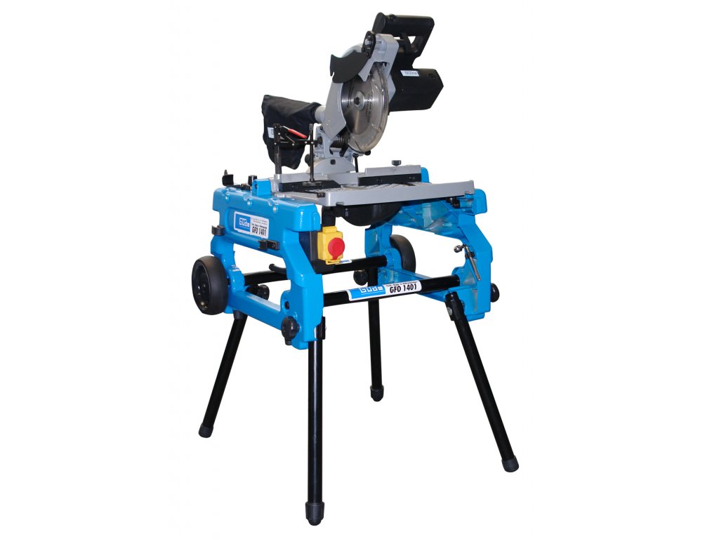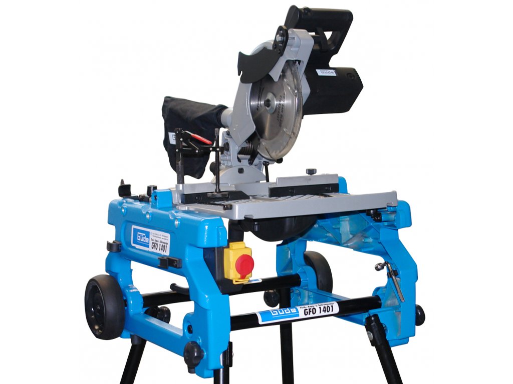 Aufbau: robuster Gussrahmen mit Transportrollen, Aluminium-Arbeitstisch (→ 390 x 460 mm), Schutzabdeckung für das Sägeblatt, Absauganschluss/Auffangsack, Längs-/Winkelanschlag, Werkstückschnellspanner, klappbare Füße.