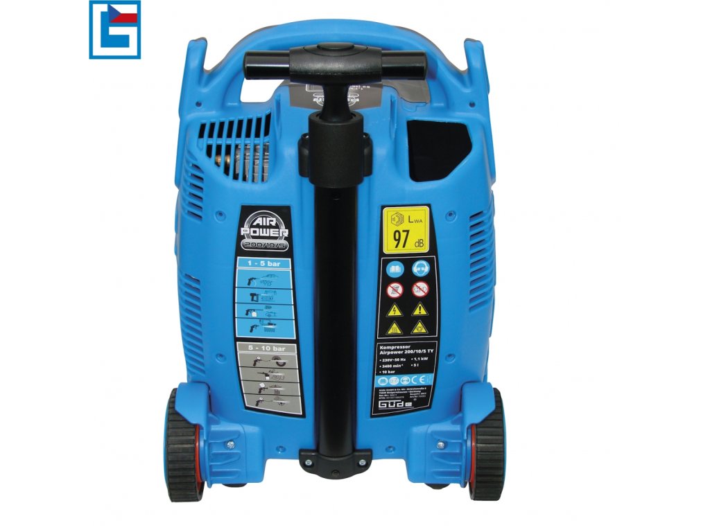 Einfache Einstellung des Arbeitsdrucks über Drehregler (→ Bereich: 0 - 10 bar); Teleskopstiel für komfortables Handling mit dem Kompressor (→ max. Auszugslänge: 500 mm).