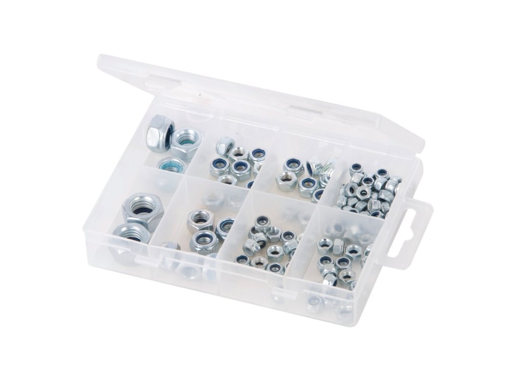 Verzinkt für Korrosionsbeständigkeit. Der integrierte Nyloneinsatz für einen festen Halt um das Gewinde ermöglicht eine sehr sichere Befestigung. Der Bausatz enthält verschiedene Größen von M4 bis M12. Praktischer Aufbewahrungskoffer mit Fächern.