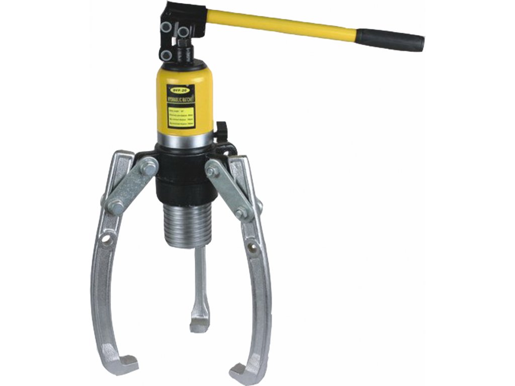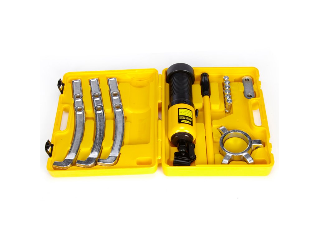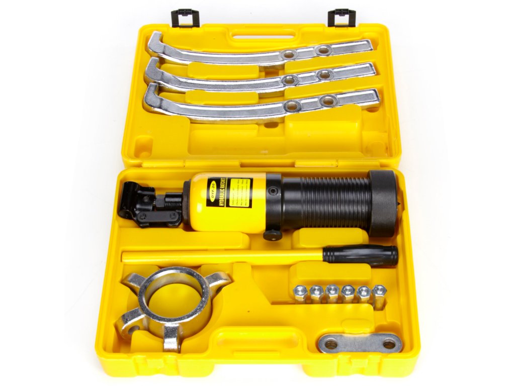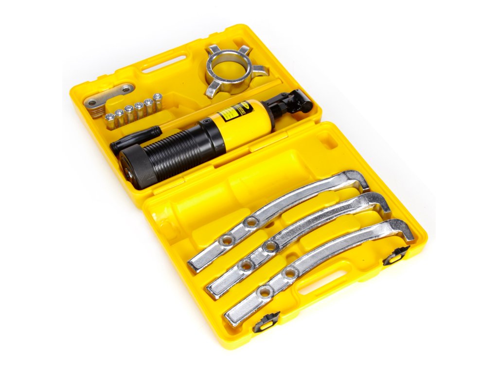 Lagerabziehvorrichtung für Riemenscheiben und Buchsen mit hydraulischer Handpumpe mit Kraft bis 20 t, flexible, Mühe sparende Vorrichtung mit kompakter Konstruktion und annehmbaren Abmessungen, einfacher Transport. 3 ausklappbare Arme mit 2 Höhenpositionen. Das Pumpengehäuse ist mit einem Gewinde zur Einstellung des Armschwenkbereichs bis zu 195 mm versehen, Bereich max. 350, Kolbengang des Hydraulikzylinders 60 mm. Im Kunststoffkoffer geliefert.