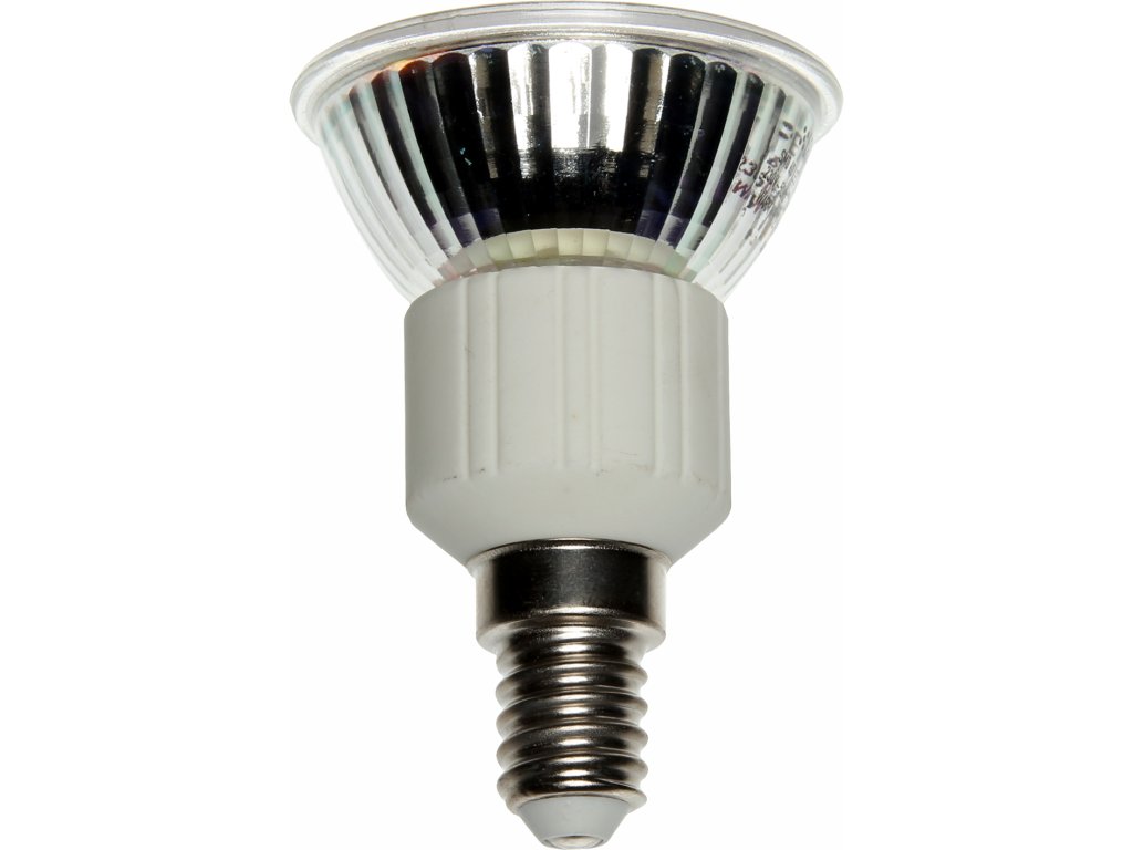 Energiesparende Lichtquelle in Glasausführung mit Sockel E14, Maße ø 50 × 78 mm, mit 60 LEDs mit Lichtstrom 220 lm bestückt, Leuchtwinkel 120°. Stromverbrauch 0,03 A; Lichtfarbe weiß, warm.