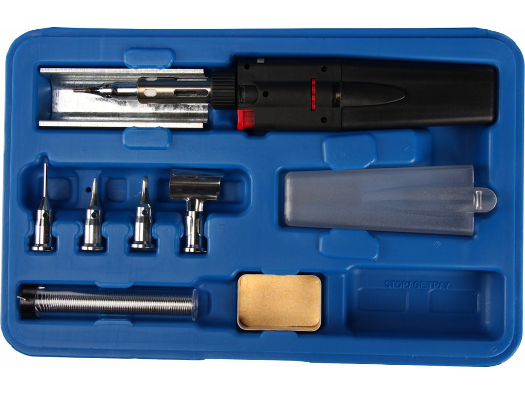 Inhalt: Gaslötlampe, verschiedene Spitzen und Aufsätze, Deflektor, Lötdraht und Schwamm. Zum Löten an den Stellen, wo eine elektrische Lötlampe nicht geeignet ist, und zum Erwärmen von Kleinteilen und Werkstoffen nutzbar. Im Kunststoffkoffer geliefert.