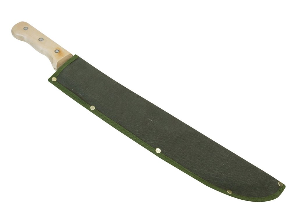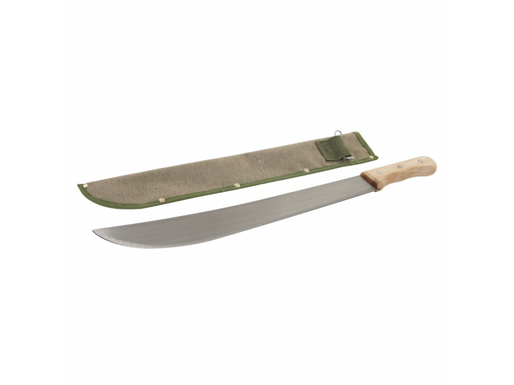Machete mit Klinge aus gehärtetem Stahl und Holzgriff. Eine Canvas-Hülle mit Gürtelschlaufe ist im Lieferumfang enthalten. Klingenlänge 450 mm.