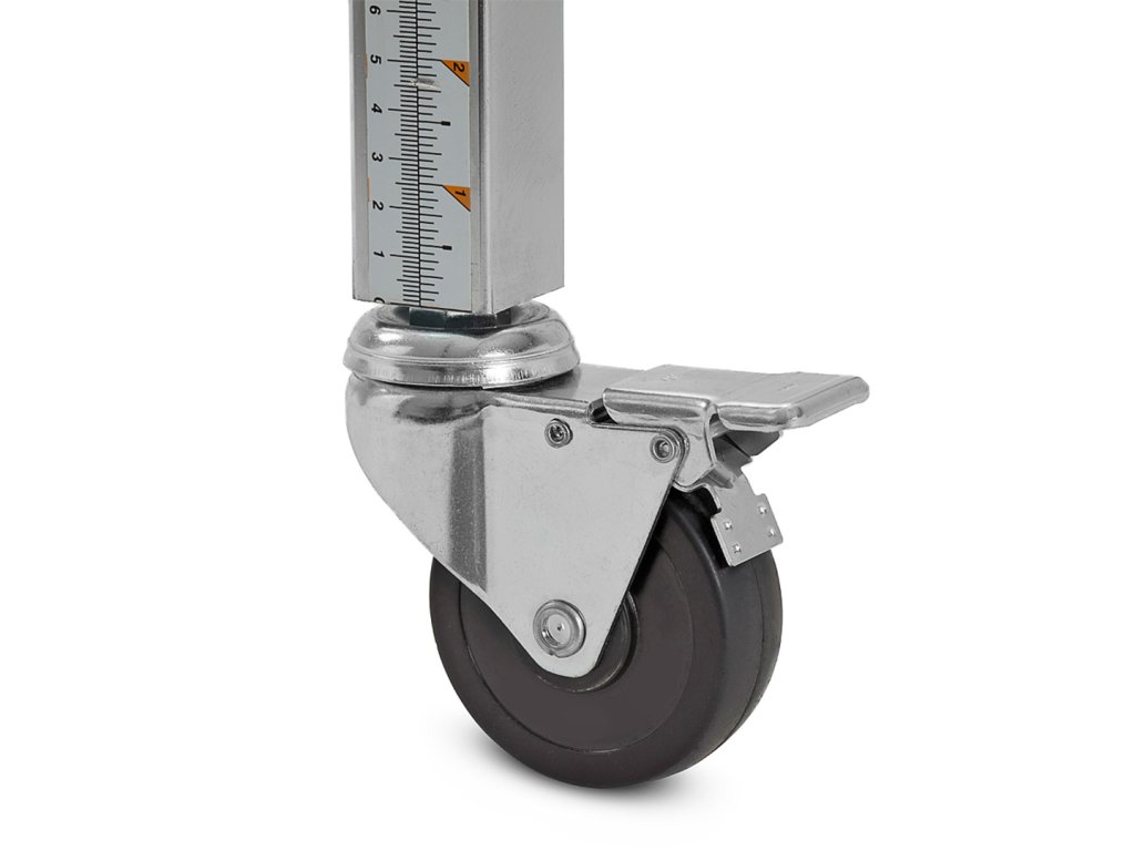 Höhenverstellbare Rollenschiene von BORA. Es lässt sich biegen, in Länge und Höhe verstellen, die Form an Ihre Bedürfnisse anpassen. Dank der integrierten Haken können mehrere dieser Gurte miteinander verbunden werden. Rollen können arretiert werden, um Stabilität zu gewährleisten. Die Schiene kann zur besseren Aufbewahrung kompakt zusammengeklappt werden. Auf den Teleskopbeinen ist ein System von Einheiten zur genauen Höheneinstellung des Förderers markiert. Maximale Einzeltragfähigkeit 136 kg.