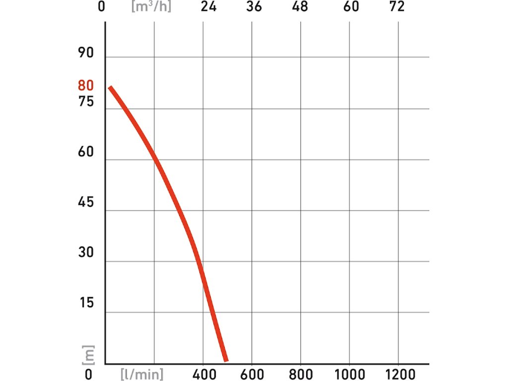 Hochdruckpumpe zum Fördern vom frischen Nutzwasser in große Höhen (bis zu 80 m), z.B. aus Teichen und Wasserspeichern. Durch ihre Fähigkeit einen hohen Druck des geförderten Wassers zu entwickeln ist diese Pumpe zur Versorgung von Druck-, Bewässerungs- und Sprühsystemen, Förderung des Wassers mit großer Überhöhung und für weitere Zwecke, wo auf den Druck ein höherer Anspruch als auf das Fördervolumen gestellt wird geeignet. Max. Saugtiefe 8 m, max. Druckhöhe 80 m, max. Fördervolumen 500 l/min. (30m3/h), Durchmesser Saug-/Ausgangsstutzen 2" (50 mm). Die Pumpe wird von einem luftgekühltem, Viertakt-Benzinmotor mit Handstarter angetrieben, max. Leistung 4,8 kW, 4 000 U/min., Hubraum 208 ccm, Verbrauch 1,2 – 1,5 l/Stunde, Behältervolumen 3,6 l. Gesamtabmessungen (H x B x L) 400 × 390 × 470 mm.