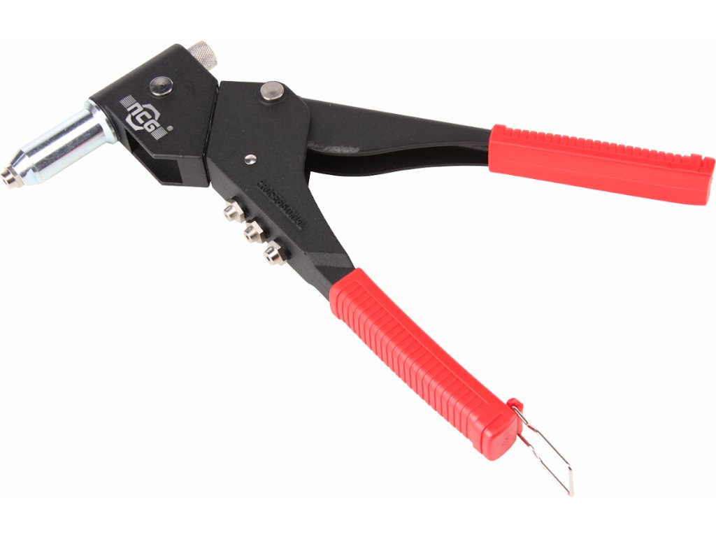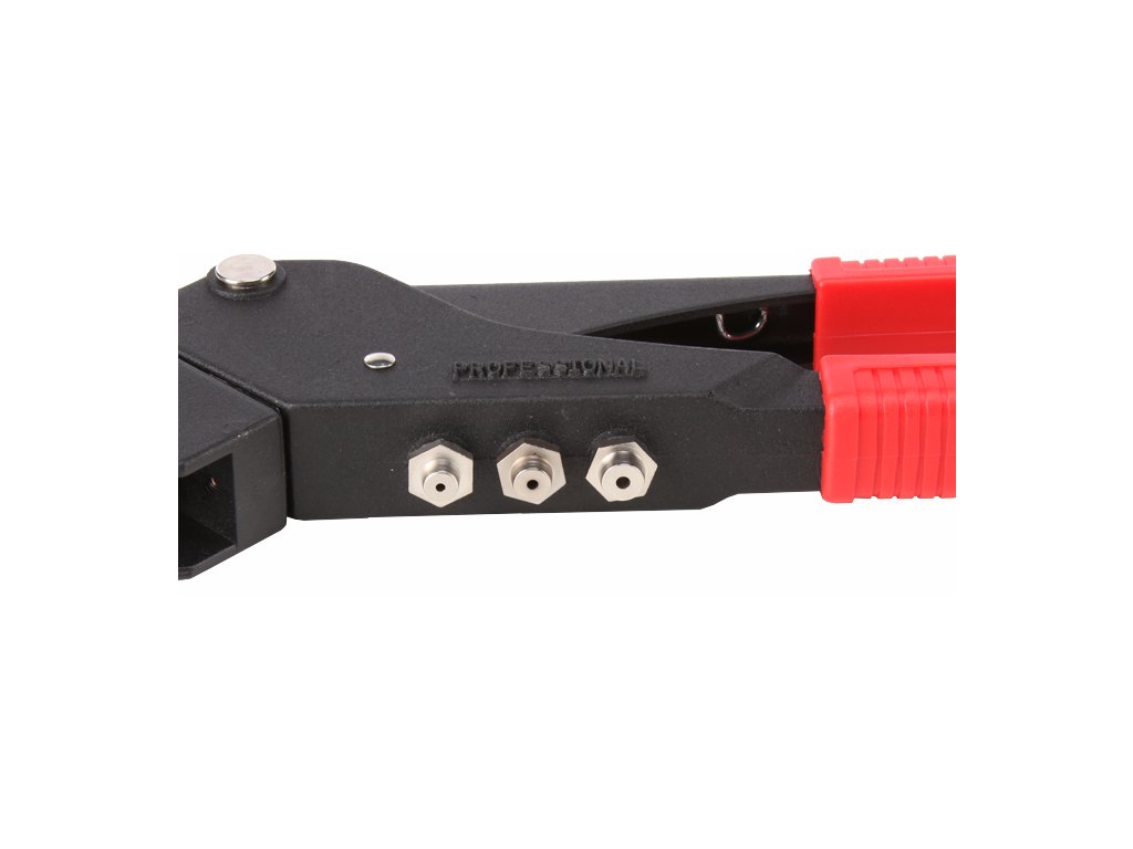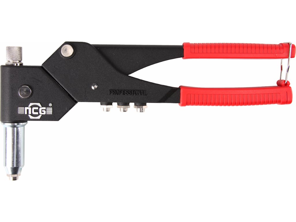 Manuelle Nietzange mit drehbarem Kopf. Für Niete 2,4 – 4,8 mm, Einnietmuttern 3 – 6 mm und Spannzangen 3 – 6 mm geeignet. In praktischem Transportkoffer verpackt.