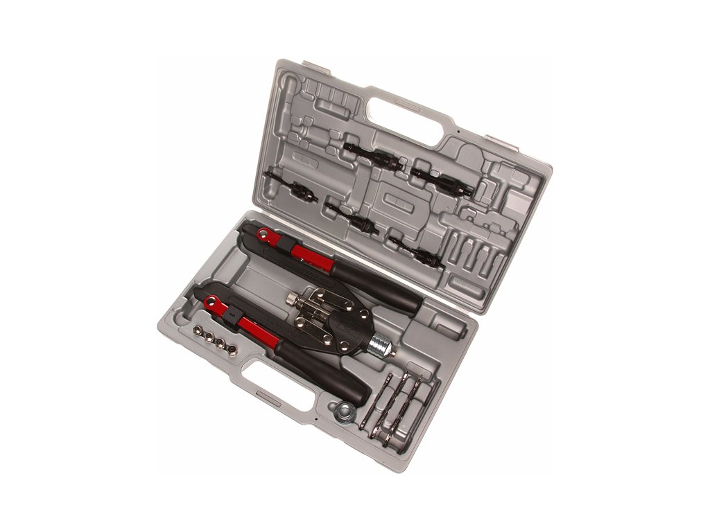 Neben der klappbaren Nietzange beinhaltet der Satz 4 Stück Spannzangen für die Niete 2,4; 3,6; 4,8; 6,4 mm; 5 Stück Matrizen für Einnietmuttern M4 × 0,7, M5 × 0,8, M6 × 1,0, M8 × 1,25, M10 × 1,5 und 3 Stück Schlüssel.