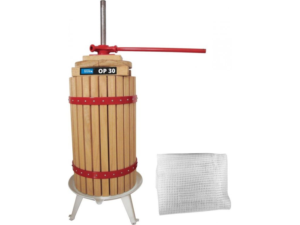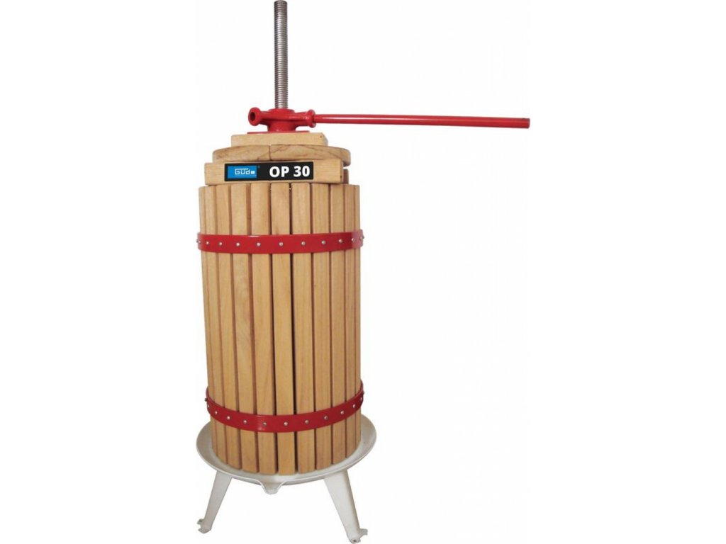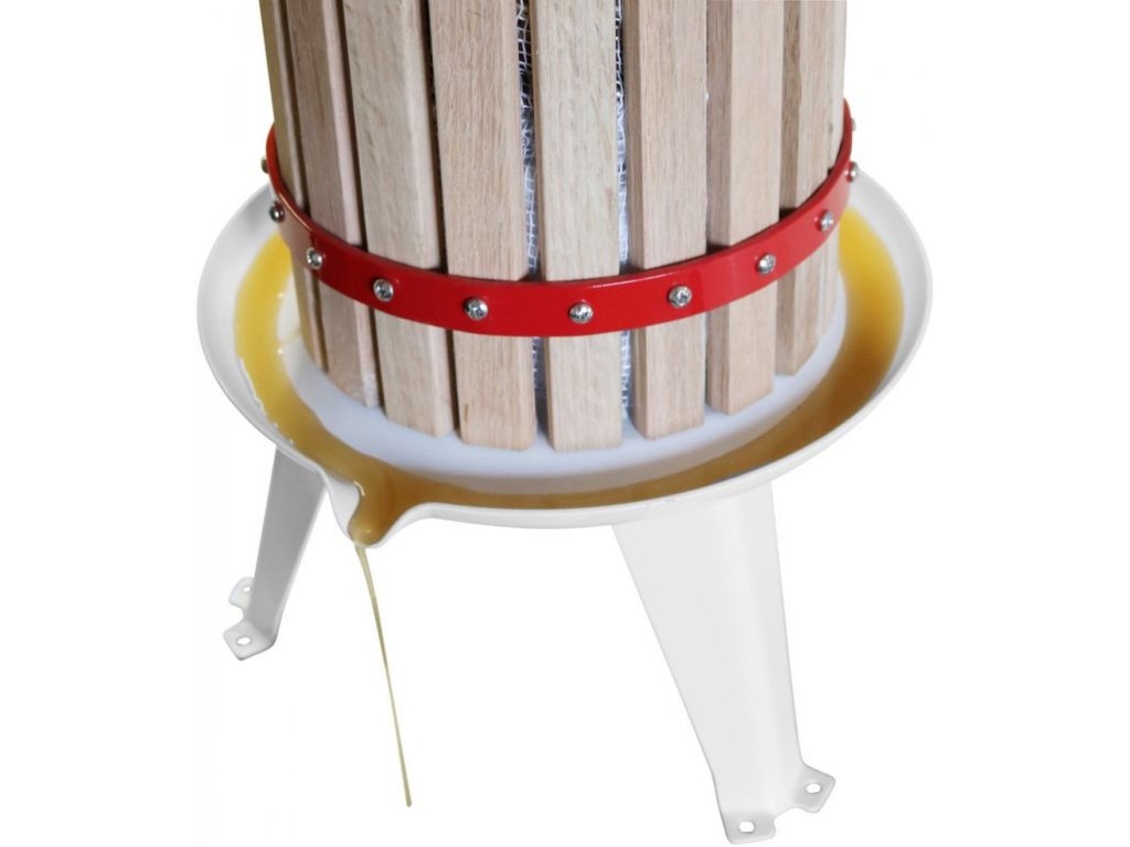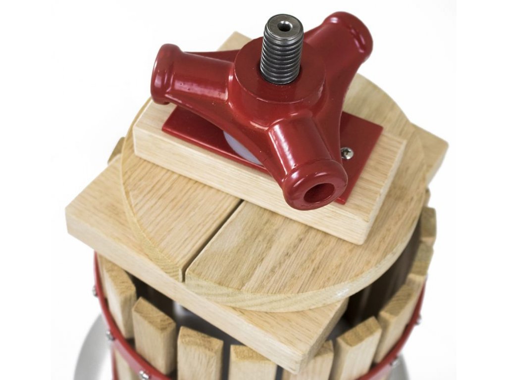 Aufbau: robuste Stahlspindel (mit Zweihandhebel), Presskorb aus Buchenholz, lackierte Auffangschale (Durchmesser: 370 mm), Sockel inkl. Löcher für feste Montage.
