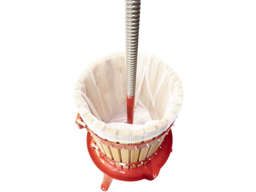 Aufbau: robuste Stahlspindel, Presskorb aus Buchenholz, lackierte Auffangschale (Durchmesser: 540 mm), Sockel inkl. Löcher für feste Montage.