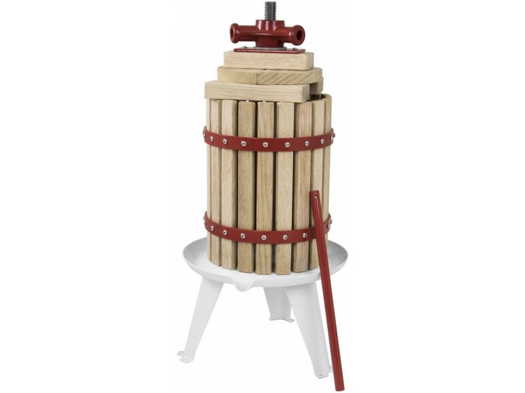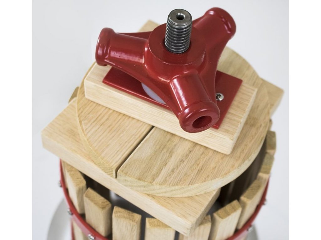 Aufbau: robuste Stahlspindel, Presskorb aus Holz, Auffangschale (→ Durchmesser: 275 mm; mit Oberflächenbehandlung nach Norm