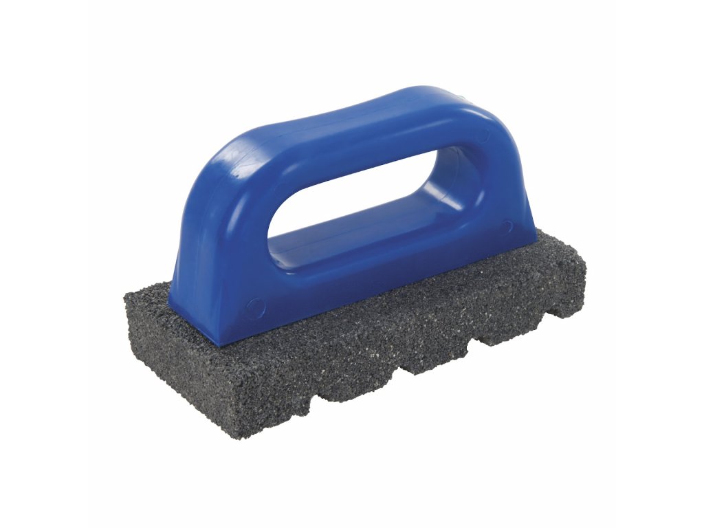Tief gerillter Schleifklotz aus Siliziumkarbid zum Reinigen von Flecken von Mörtel, Beton, Putz usw., ausgestattet mit einem Griff für komfortables Mnaipulation. Rauheit P20, Größe 155 x 78 x 25 mm.